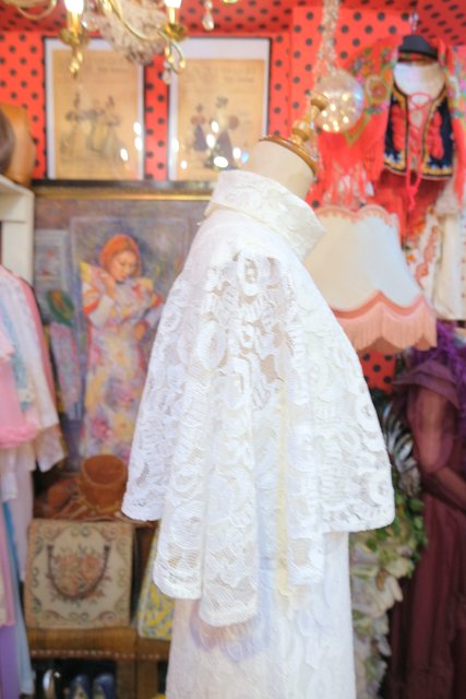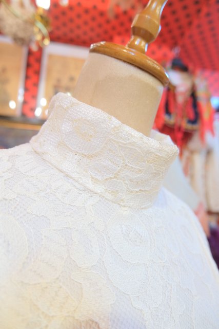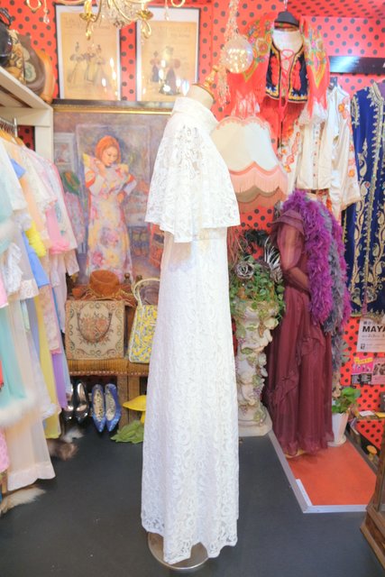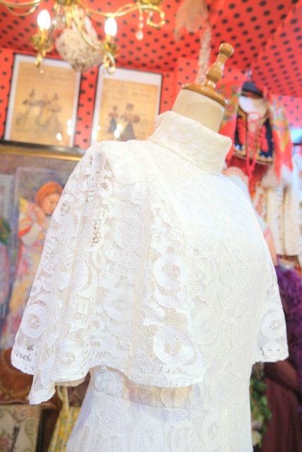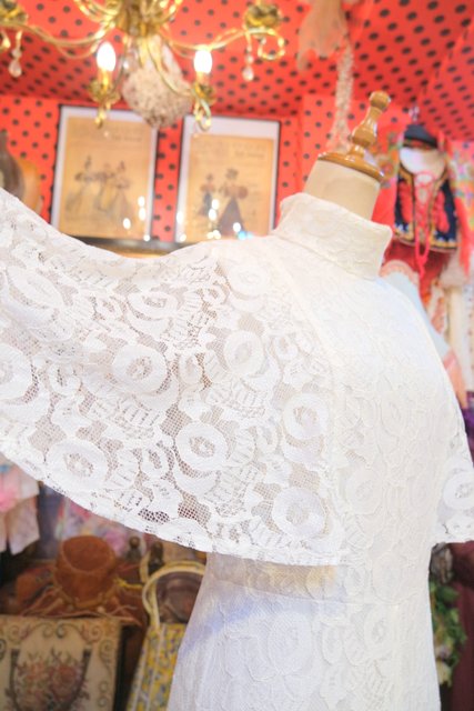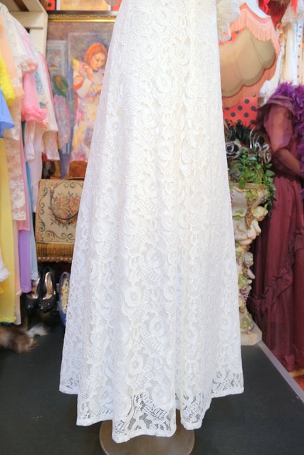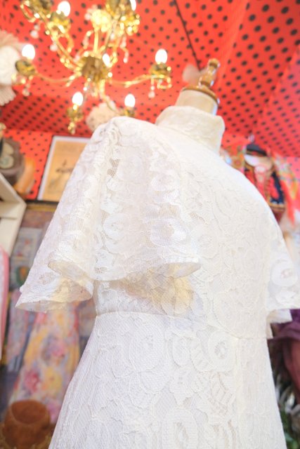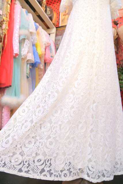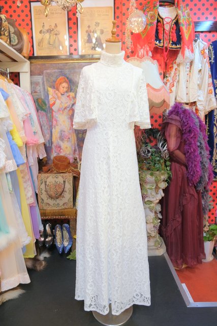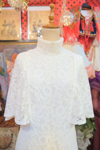 繊細で華やかな総レースデザインに上品でクラシカルな印象のハイネック×ドレープ感がエレガントなフレア袖が魅力的な1960~70年代頃のヨーロピアンヴィンテージウエディングドレス