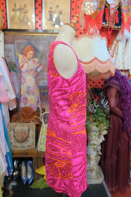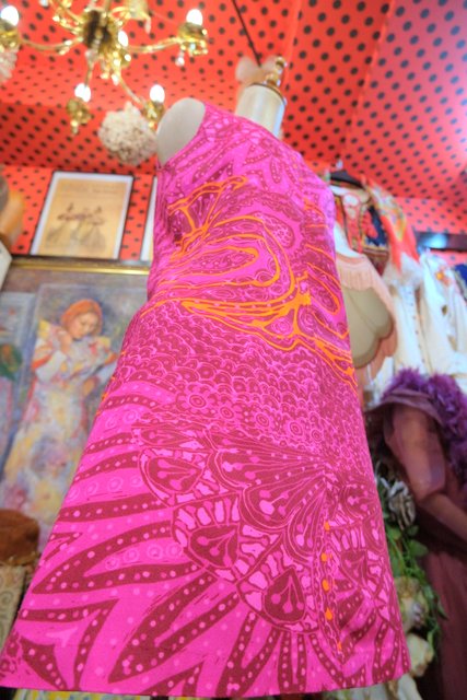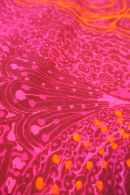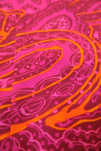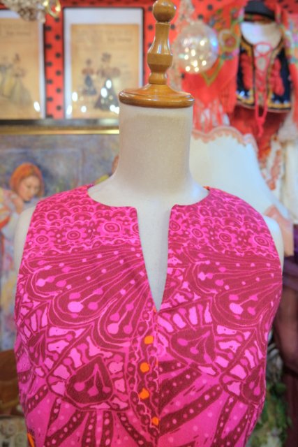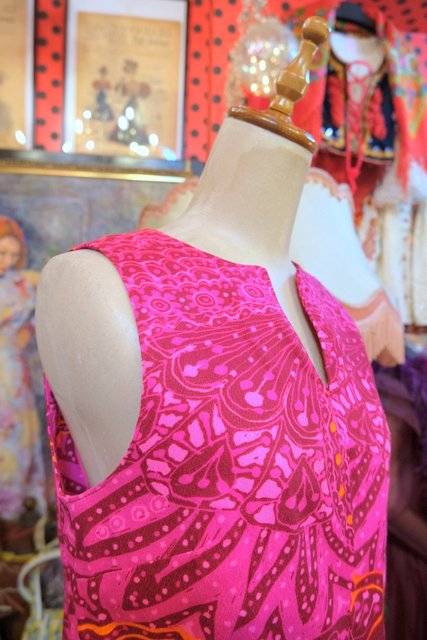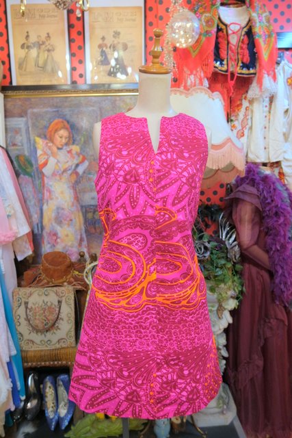 ピンク、ガーネットベースのサイケデリックな総柄が素敵な1970年代頃のヨーロピアンヴィンテージミニワンピース