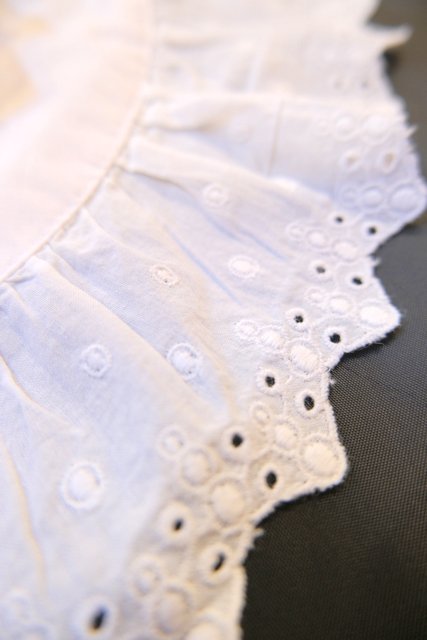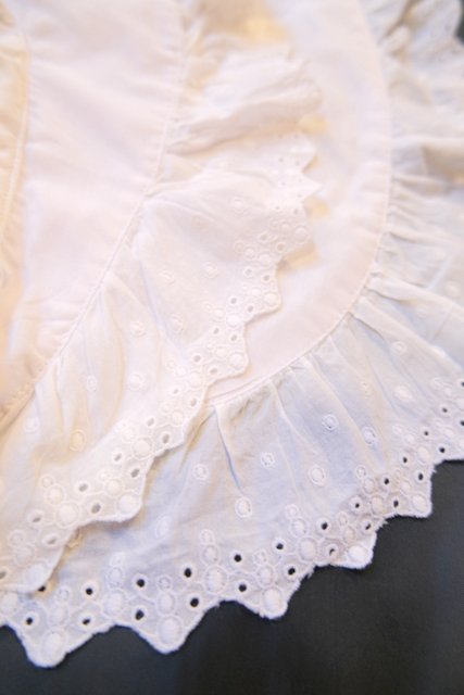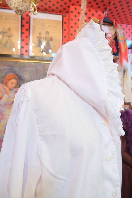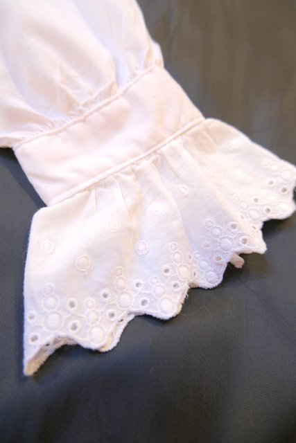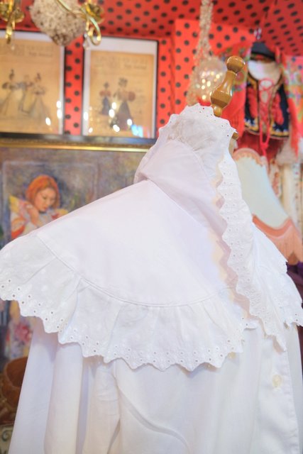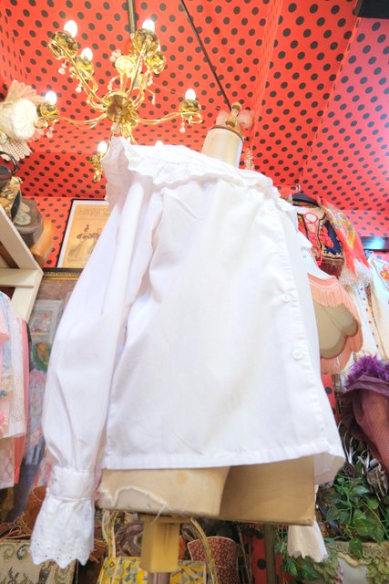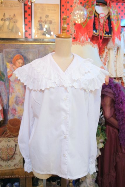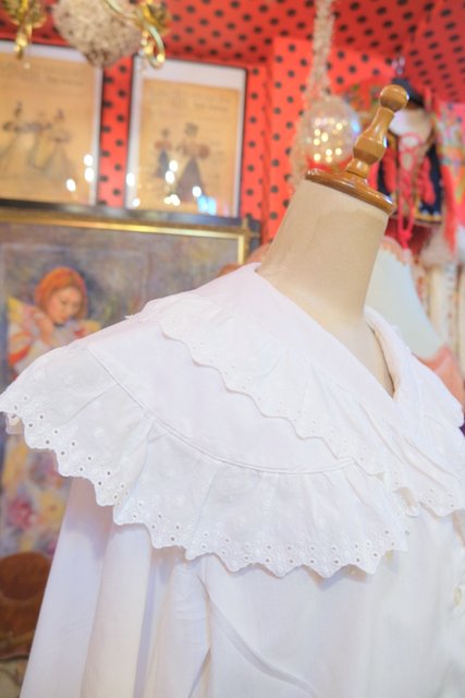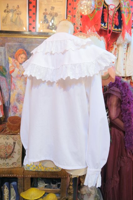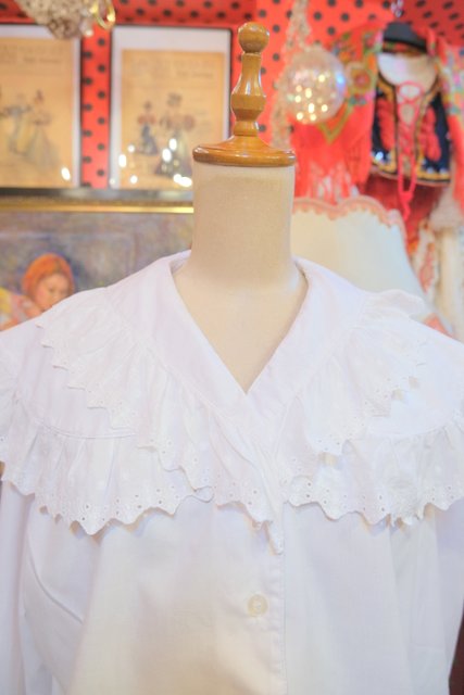 カットワークレース付きのボリューミーなプラッターカラーや袖先のフリルデザインが可愛らしい1970~80年代頃のヨーロピアンヴィンテージブラウス