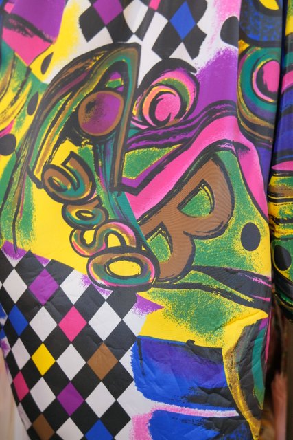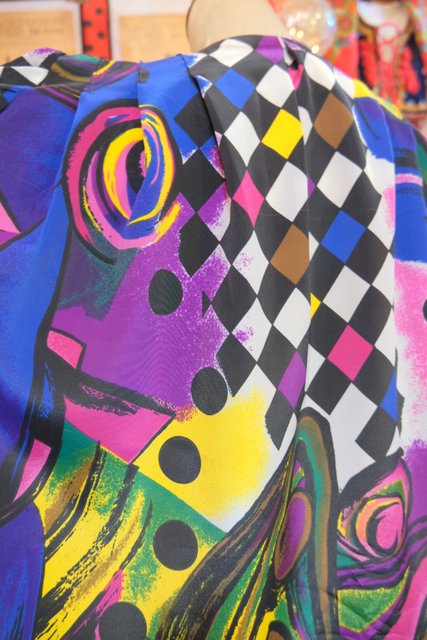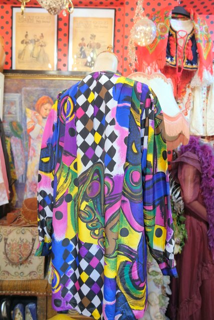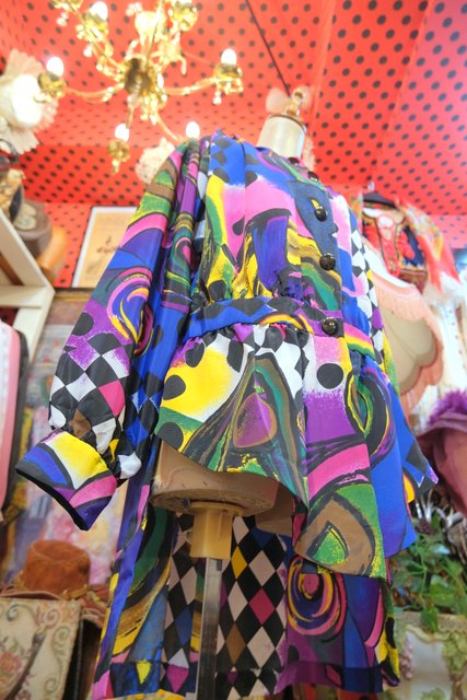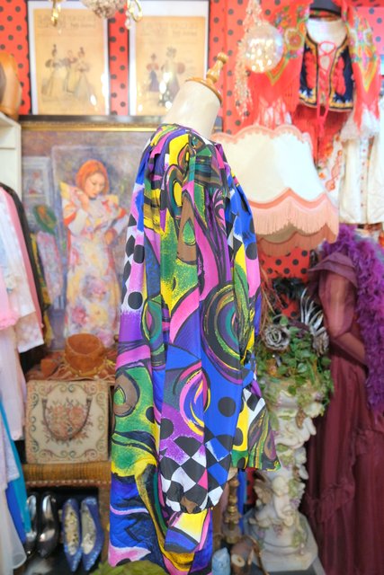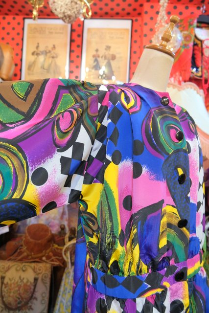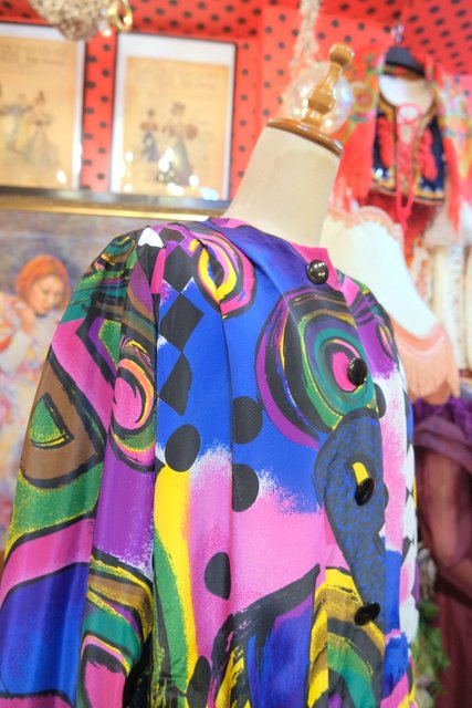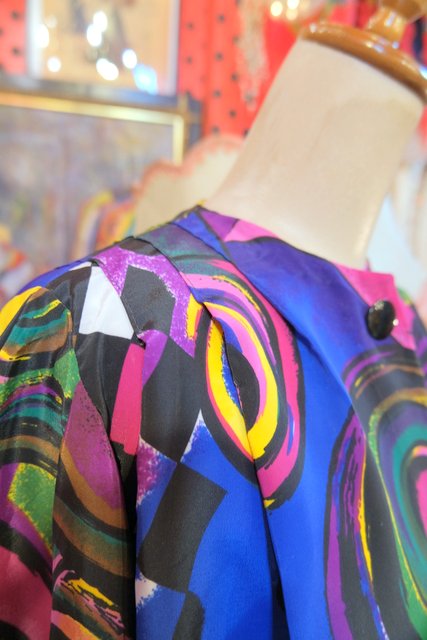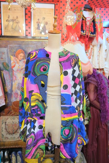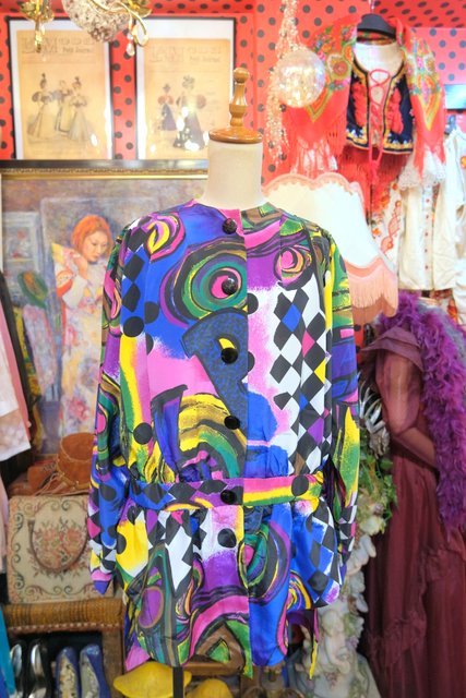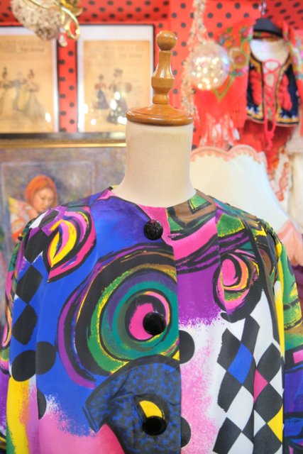 目を惹くカラフルアートなプリントにペプラムや後ろ着丈が長いデザインがお洒落な1980年代頃のハンドメイドシャツジャケット