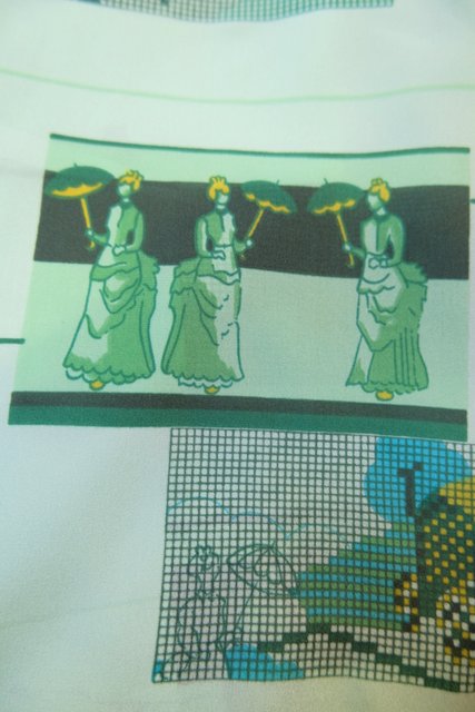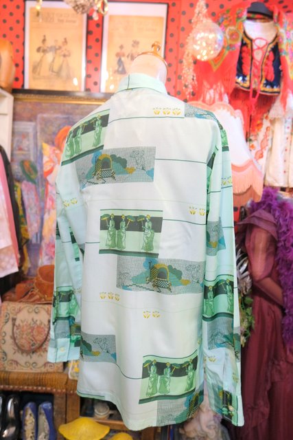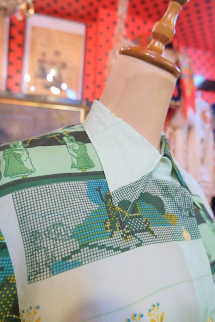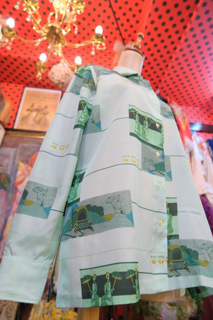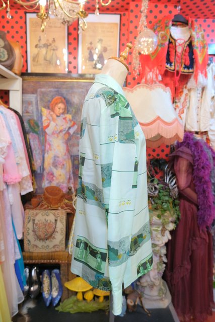 淡いグリーンベースにレトロな貴婦人柄やポップなお花プリントが可愛らしい1960~70年代頃のフランス製ヴィンテージブラウス