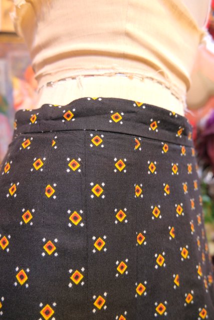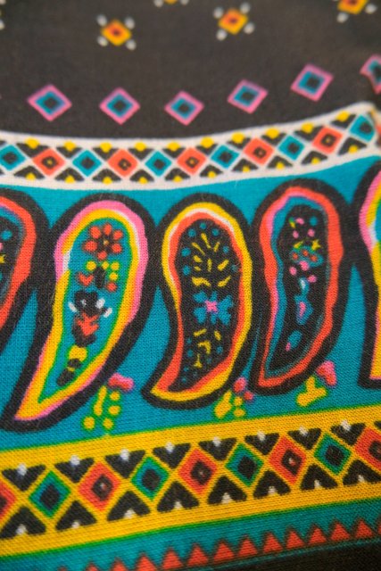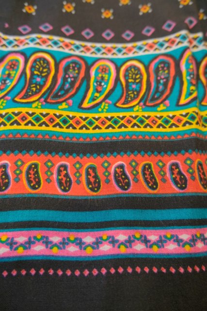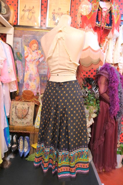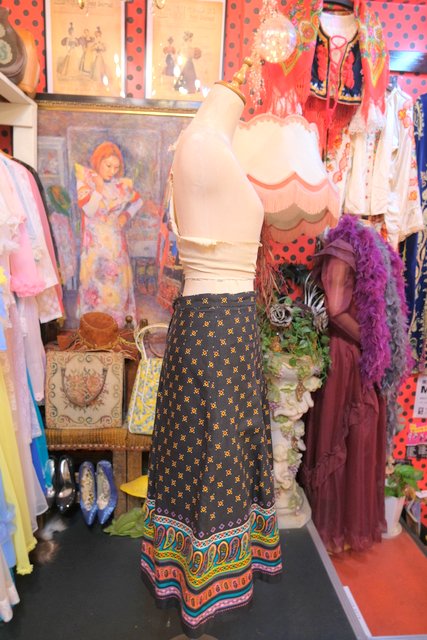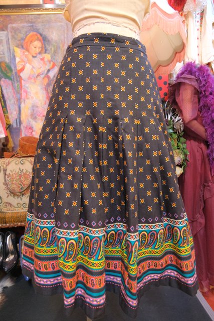 黒ベースにカラフルポップなペイズリー柄が可愛らしい1970年代頃のヨーロピアンヴィンテージスカート