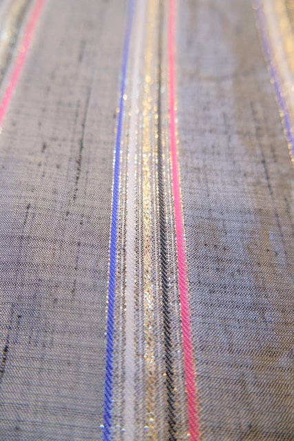 グレイベースにピンク、ブルー、ゴールドなどのメタリックラインがお洒落な1980年代頃のヨーロピアンラメブラウス