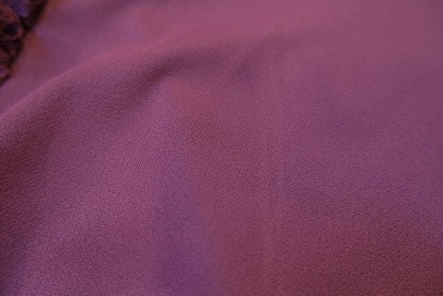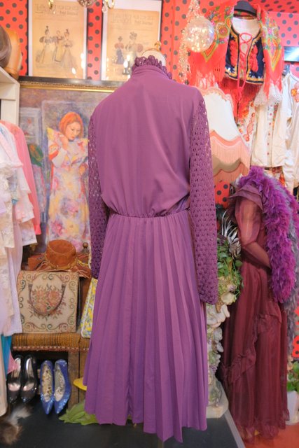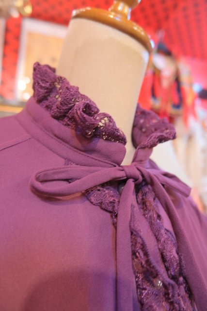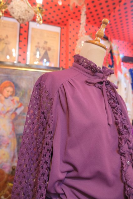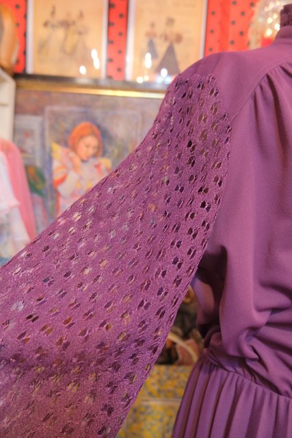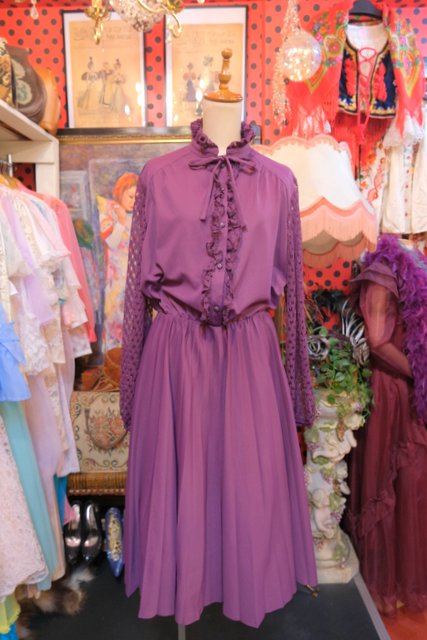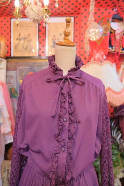 レトロガーリーなフリル立ち襟×前立てデザインに透け感があるレース袖が魅力的な1970年代頃のヨーロピアンヴィンテージワンピース