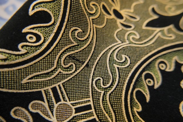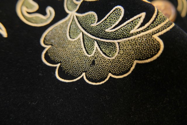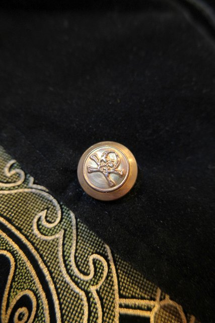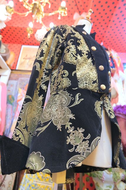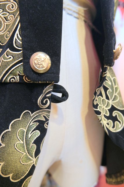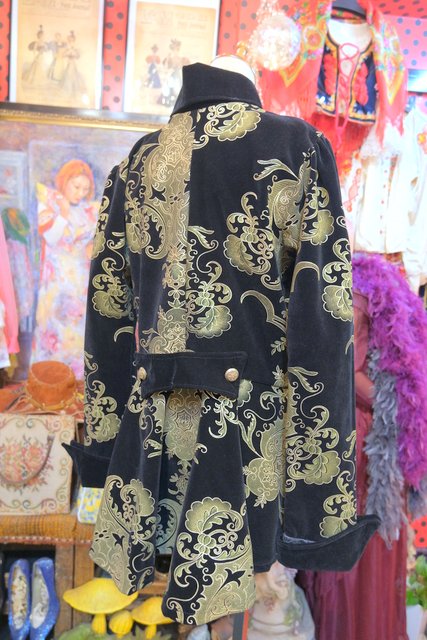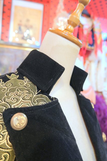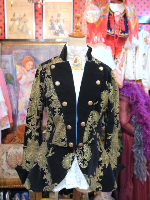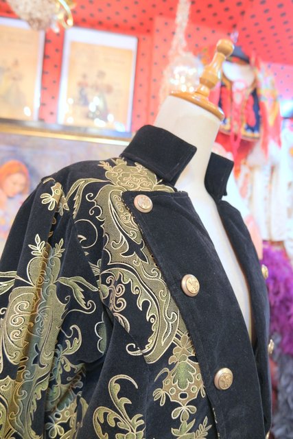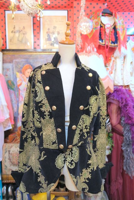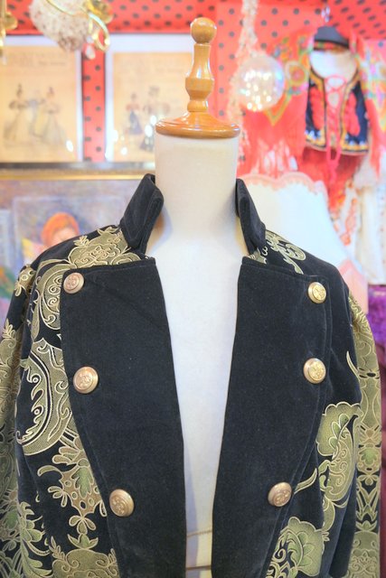 クールな印象のベロアスタンドカラーにドクロマークボタンやサイケデリックなゴージャスプリントがカッコいい1980~90年代頃のヴィンテージナポレオンジャケット