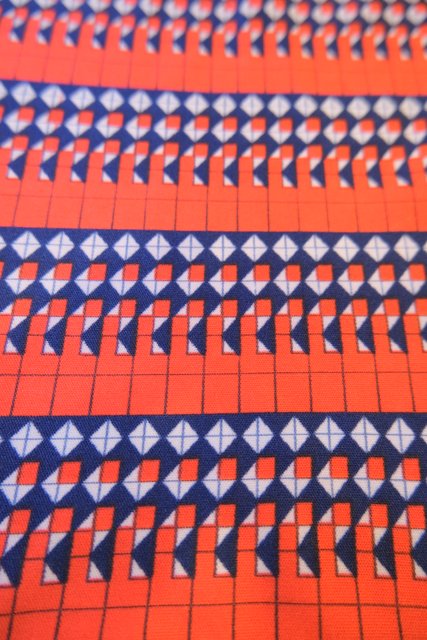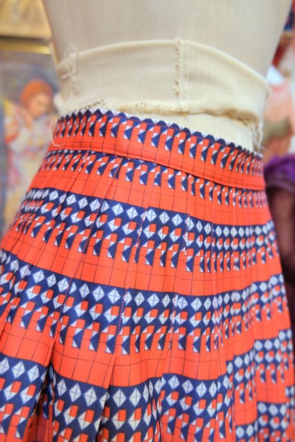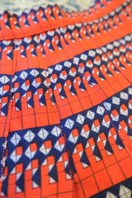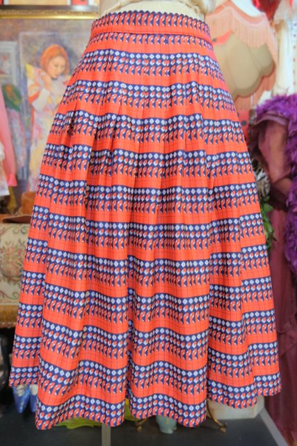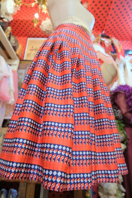 赤ベースに白×ネイビーのレトロなジオメトリック柄が魅力的な1970年代頃のヨーロピアンヴィンテージスカート