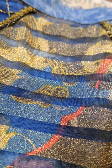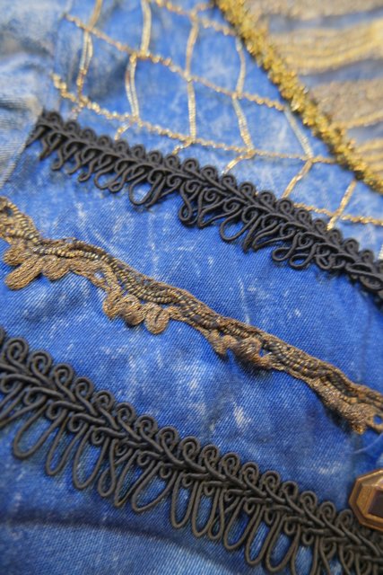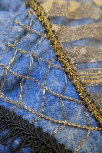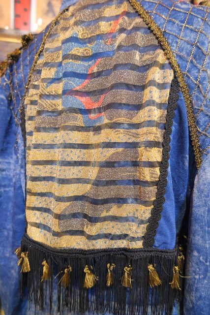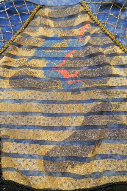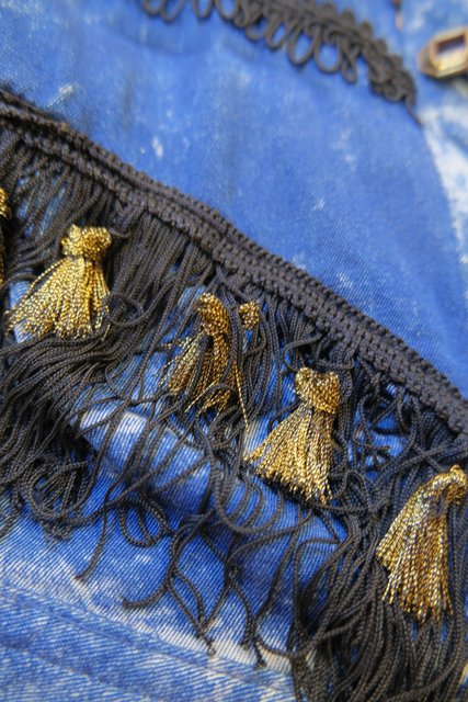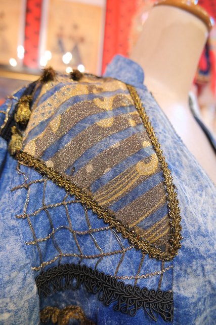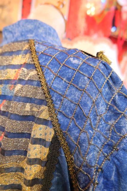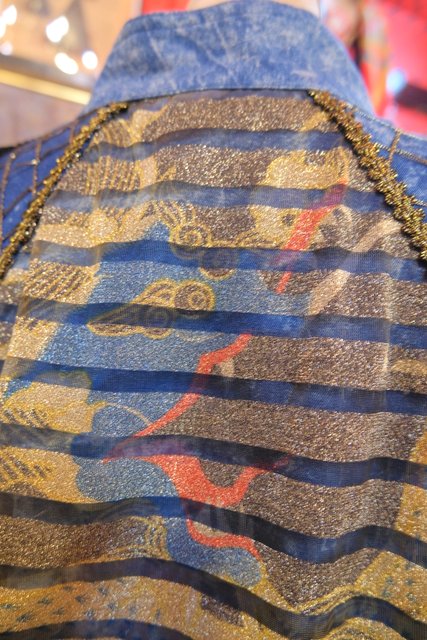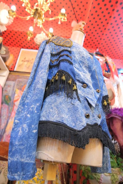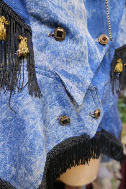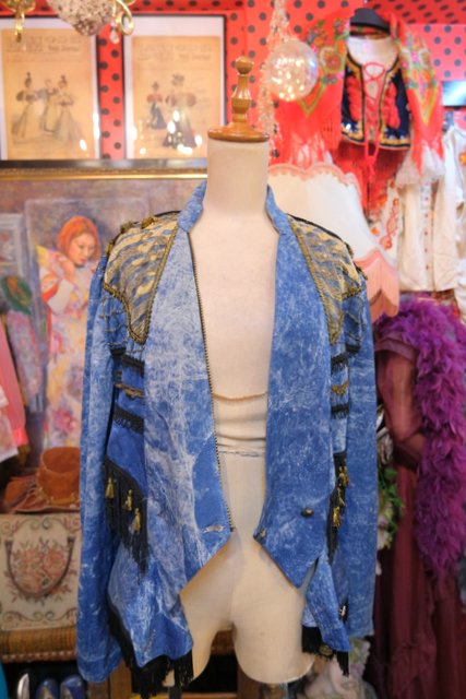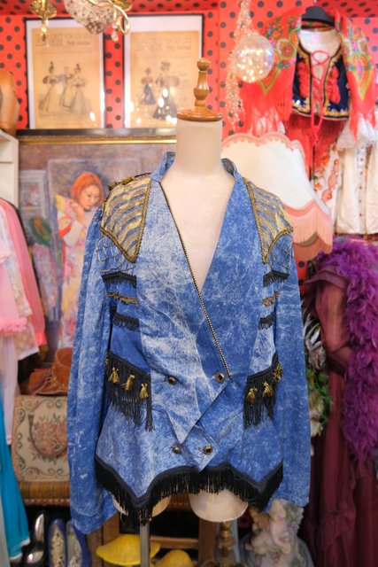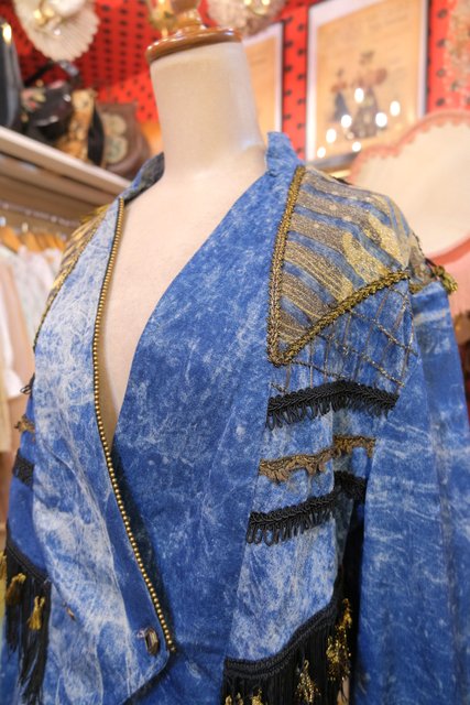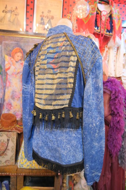 個性的なケミカルウォッシュデニムにゴールドのブレードテープやメッシュ、タッセル付きフリンジ、龍がプリントされたゴールドラメのレイヤードデザインなどディテールのバランスがとても素敵な1980年代頃のフランス製ヴィンテージジャケット