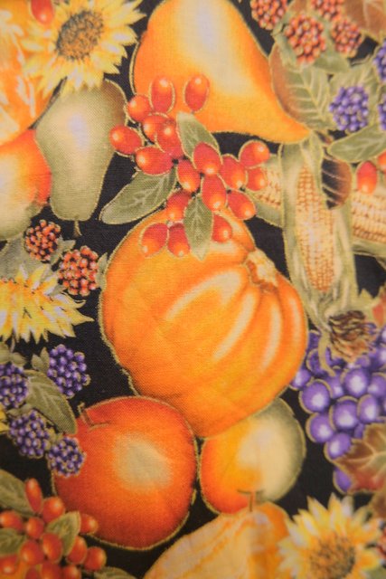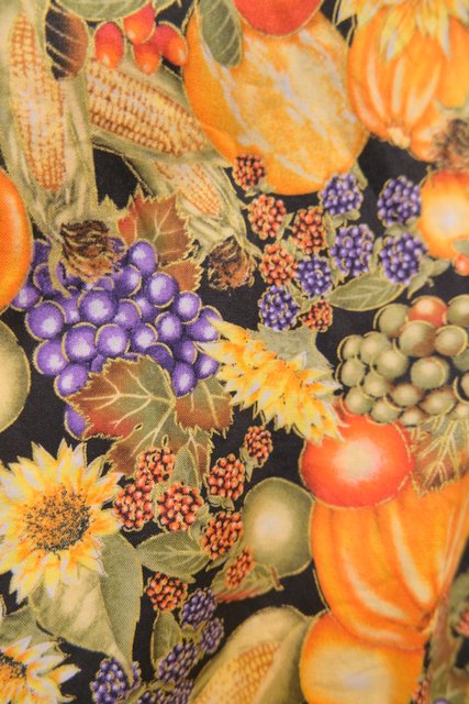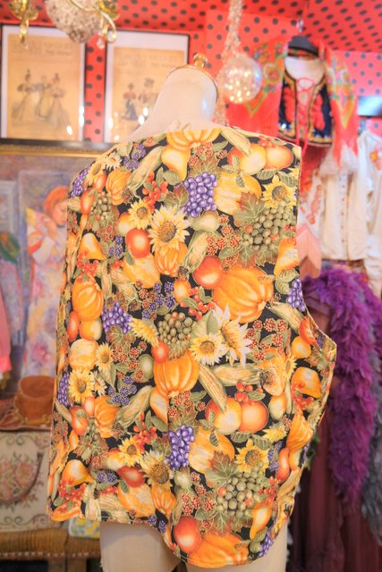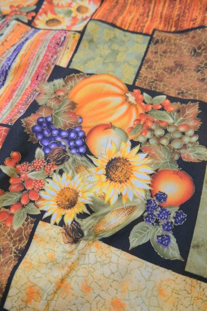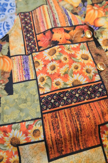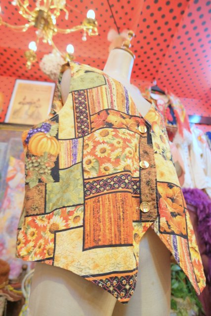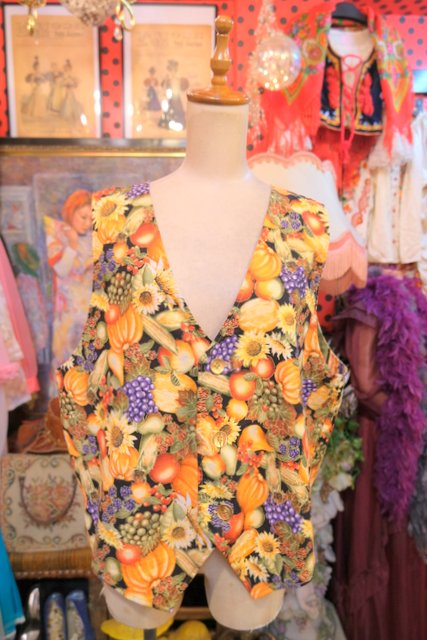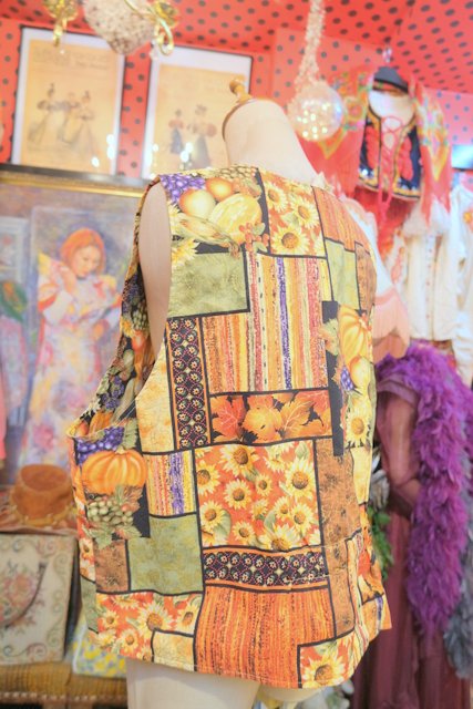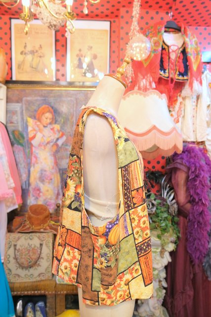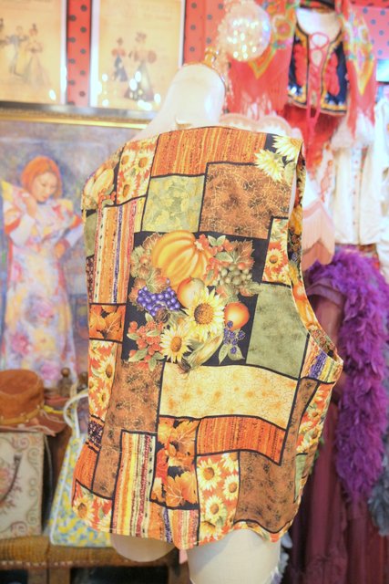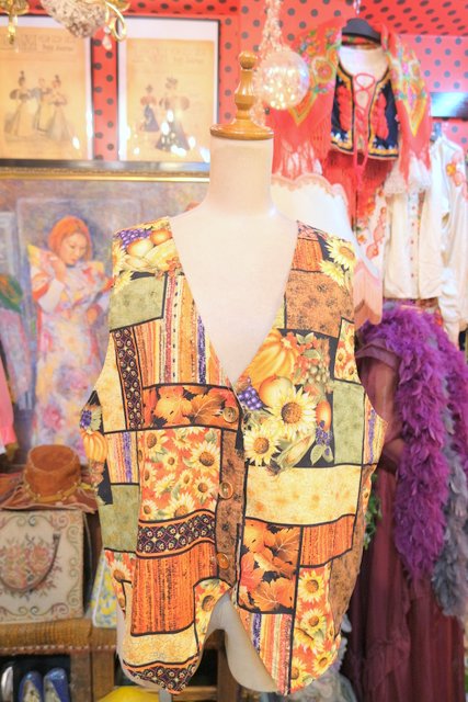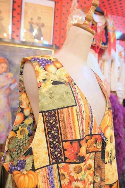 ヒマワリや椛、木の実、レトロ模様のパッチワークプリントが可愛らしい1980~90年代頃のヨーロピアンリバーシブルベスト