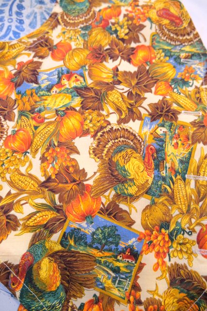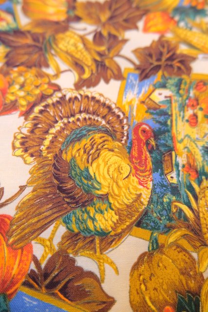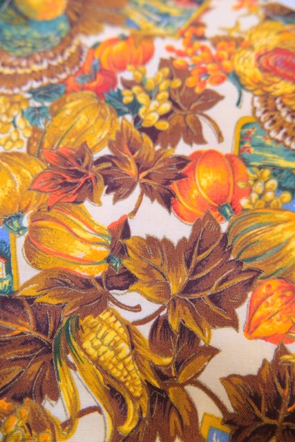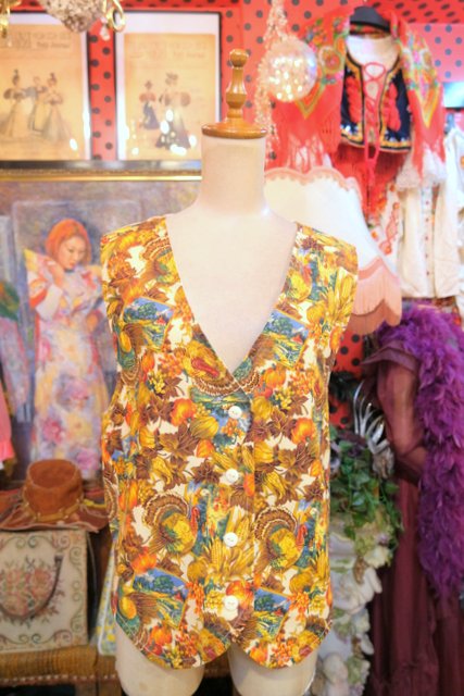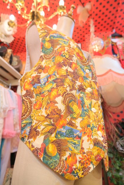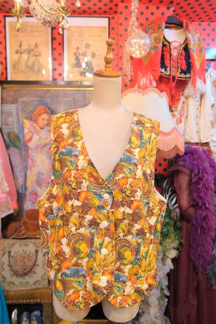 木の実やリーフ、シチメンチョウ、風景画などのカントリーなプリントが可愛らしいヨーロピアンレトロベスト