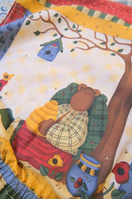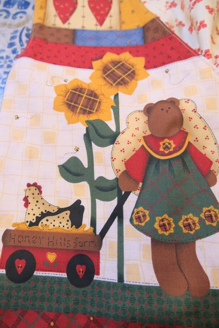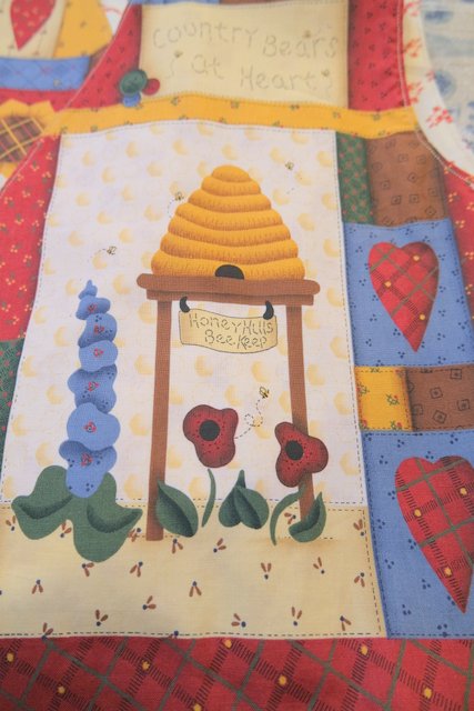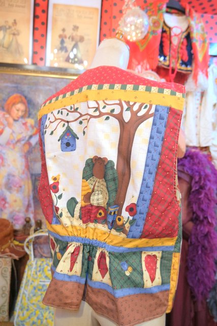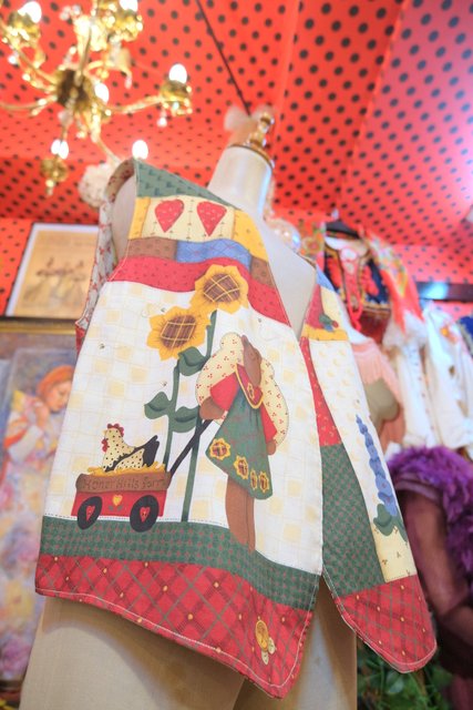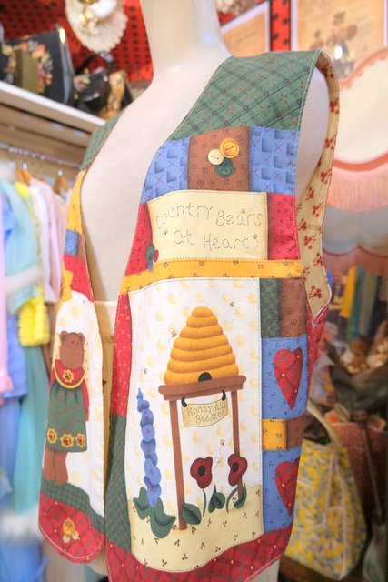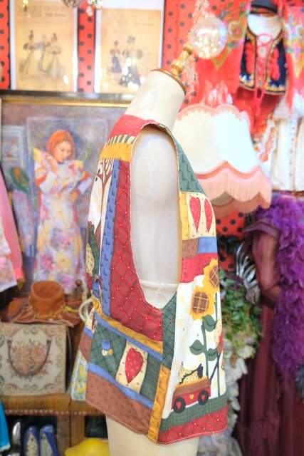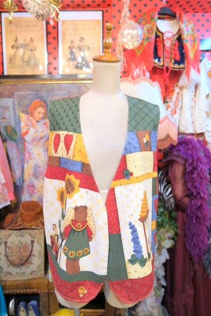 小花柄やチェック、ハート、可愛いクマさんとミツバチのカントリーなパッチワークプリントが魅力的なヨーロピアンガーリーベスト