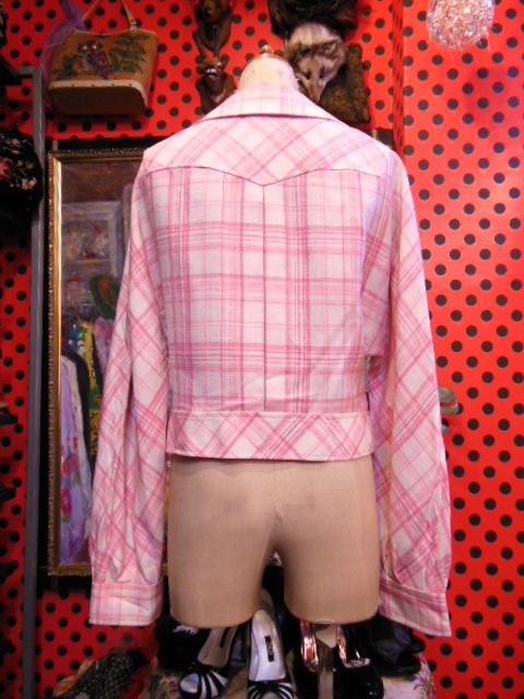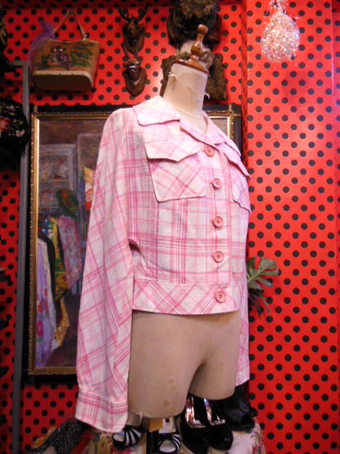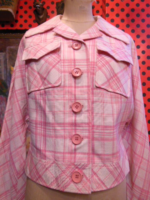ピンクのチェック柄とピンクレトロボタンがキュートな1970~80年代頃のヴィンテージジャケット!色合いが春にぴったりの一着です!