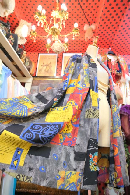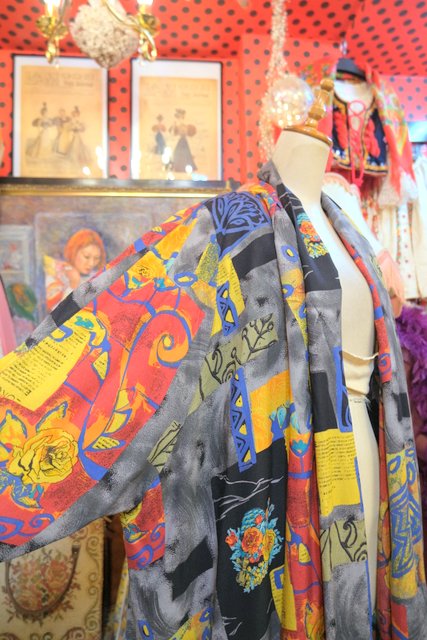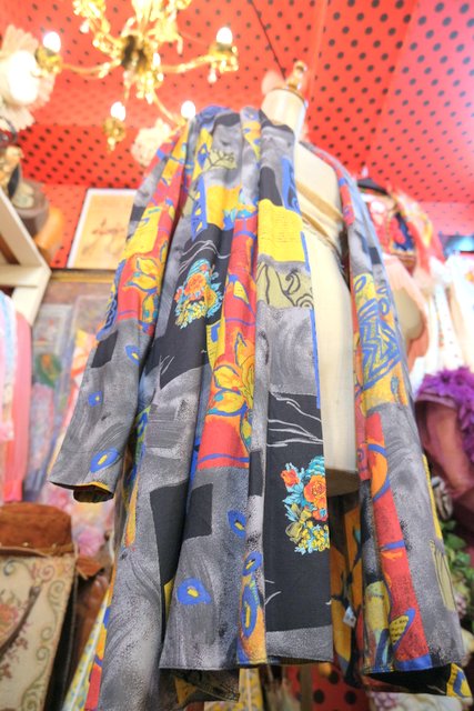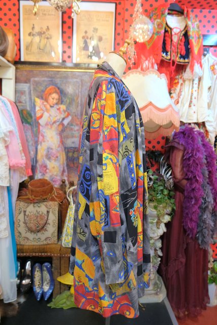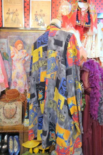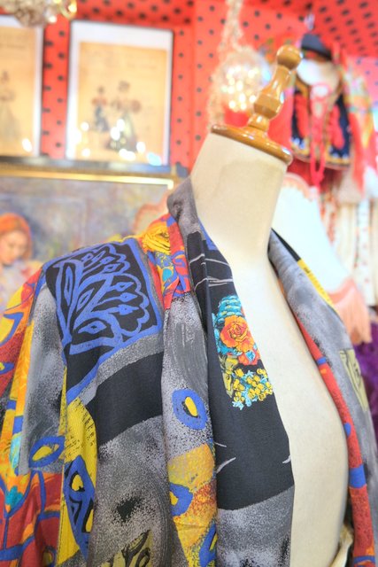 レトロでカラフルな総柄にショールカラーがお洒落な1980年代頃のヨーロピアンヴィンテージシャツ羽織