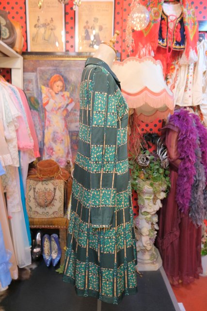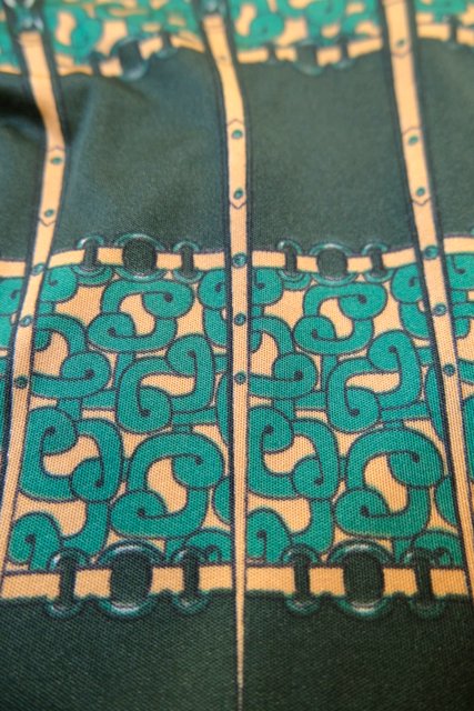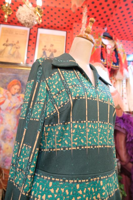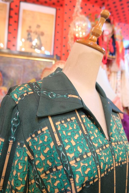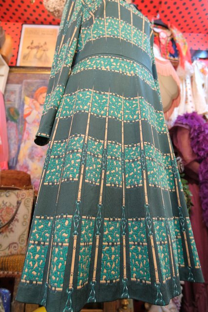 深緑色ベースにベージュ×グリーンのレトロ模様が目を惹く1960年代頃のフランス製ヴィンテージワンピース