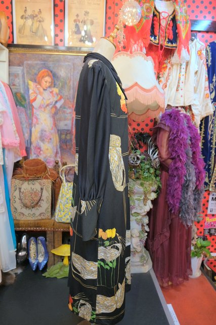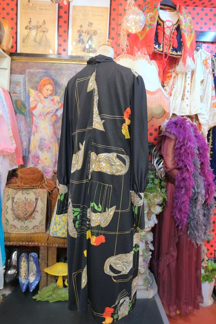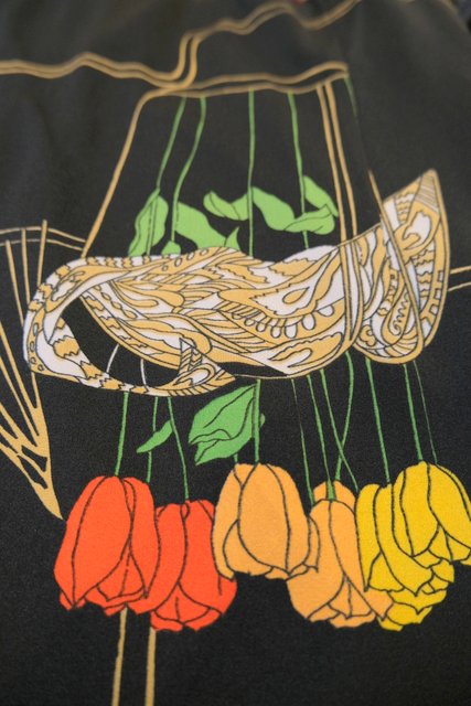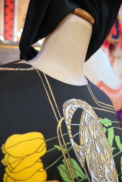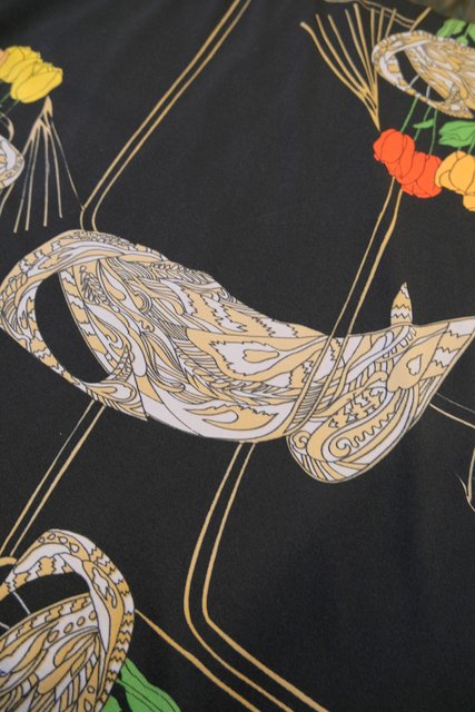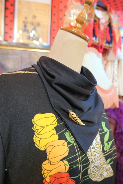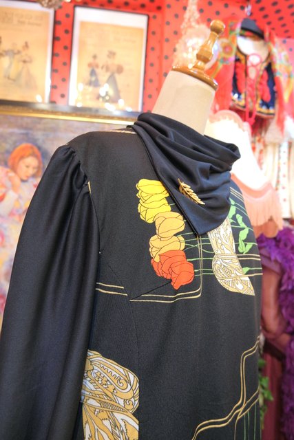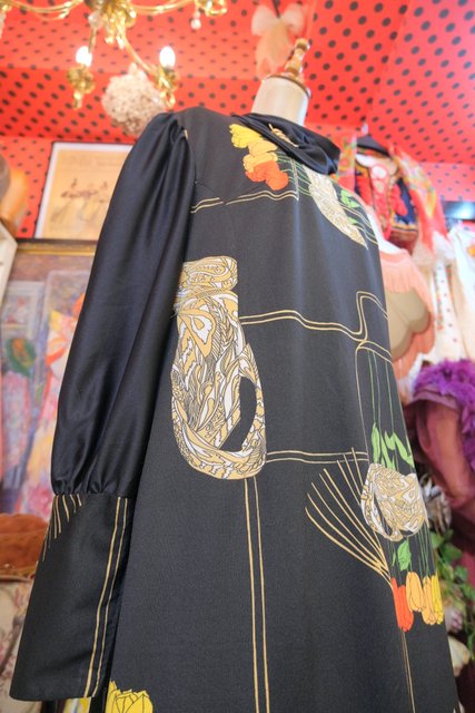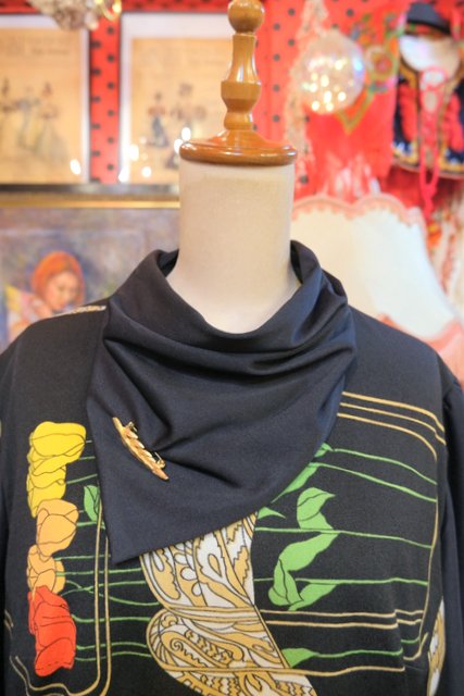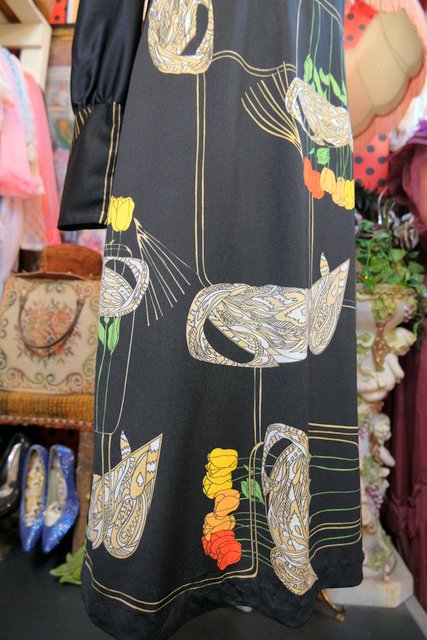 ペイズリーのようなリーフ×カラフルなチューリップ柄にブローチ付きのスカーフネックや袖の膨らみが強調されるロングカフスがお洒落な1970年代頃のヨーロピアンヴィンテージワンピース