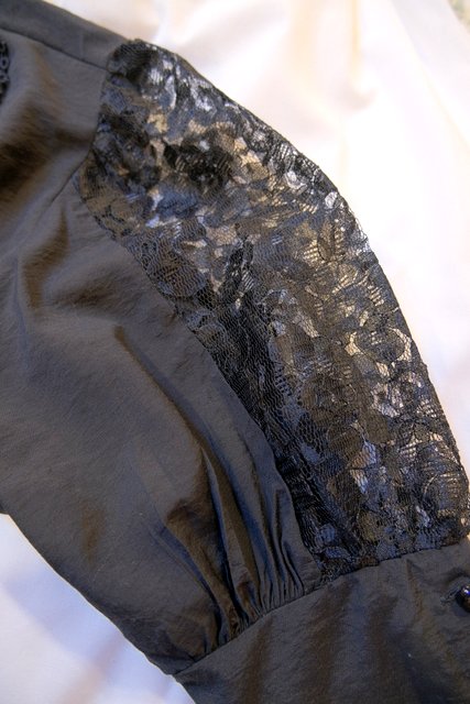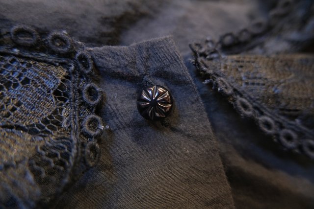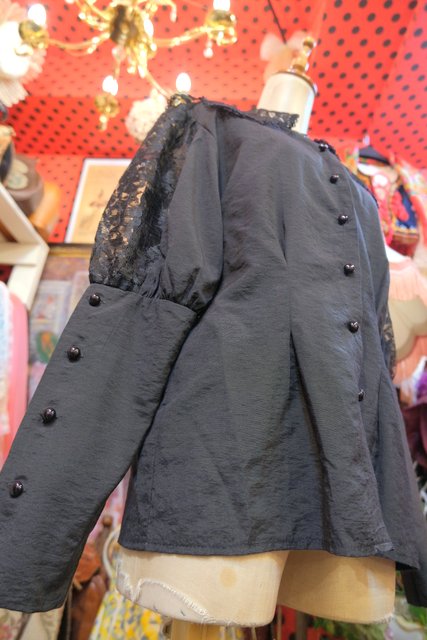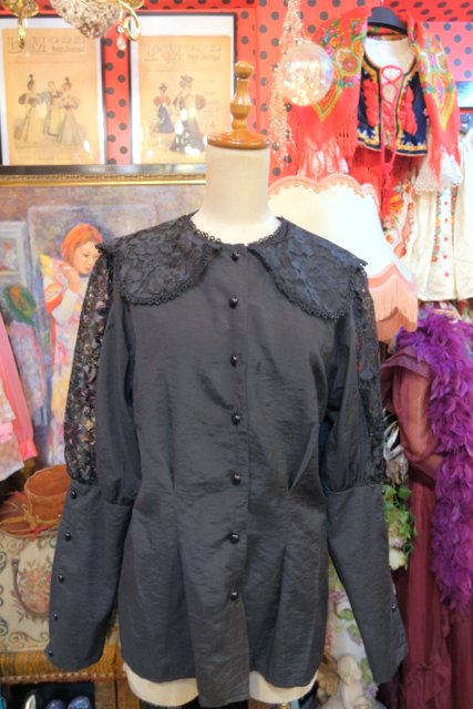 黒花柄レースの大きな襟×アームの透け感に袖の膨らみが強調されるロングカフスが素敵なヨーロピアンゴシックブラウス