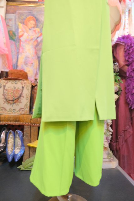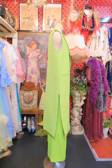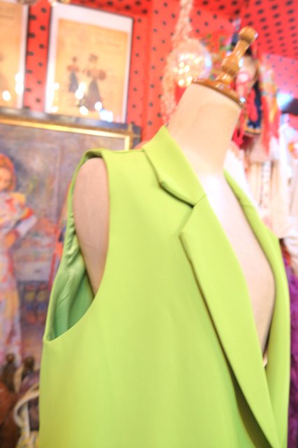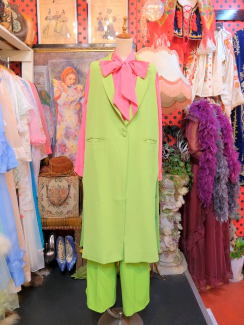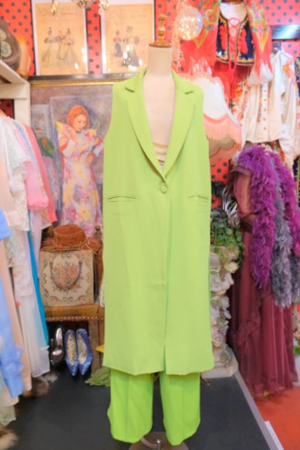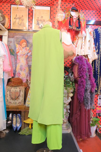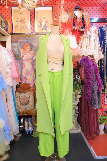 カラフルポップな黄緑色が目を惹くヨーロピアンノースリーブロングジャケット×パンツのセットアップ