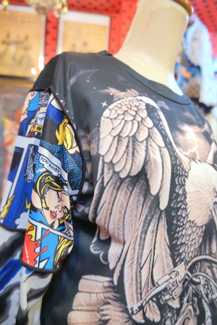 伸縮性のある異素材ドッキングデザインがユニークでインパクトたっぷりのヴィンテージリメイクカットソー ブラウスやタートル、シャツワンピースと合わせてもお洒落な個性派アイテム!