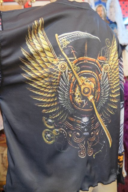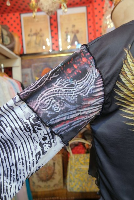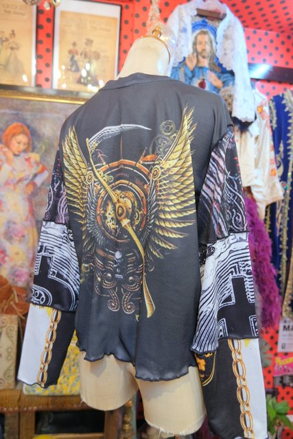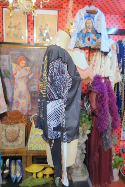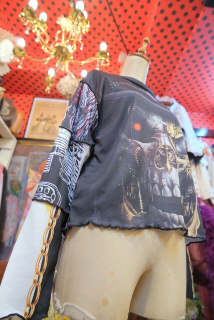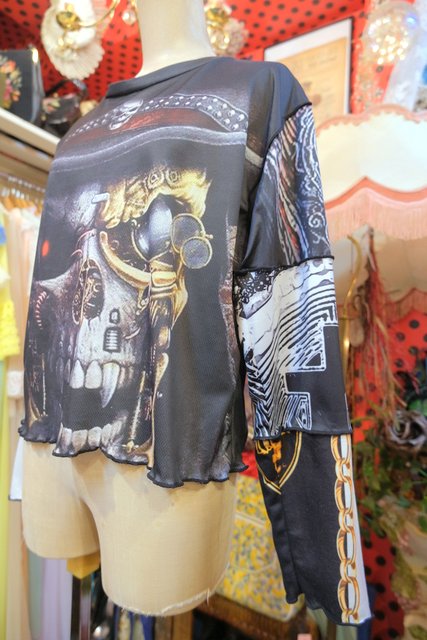 伸縮性のある異素材ドッキングデザインがユニークでインパクトたっぷりのヴィンテージリメイクカットソー ブラウスやタートル、シャツワンピースと合わせてもお洒落な個性派アイテム!