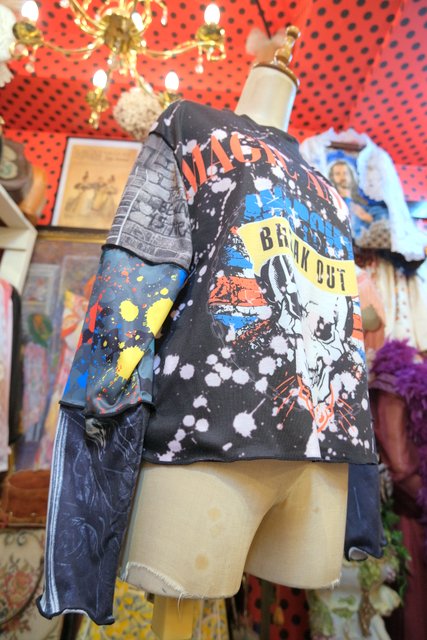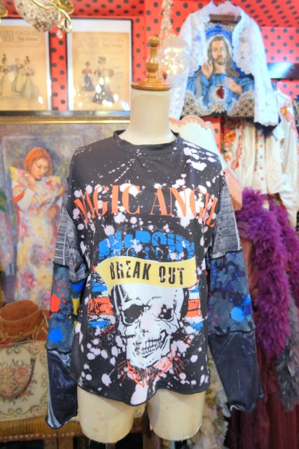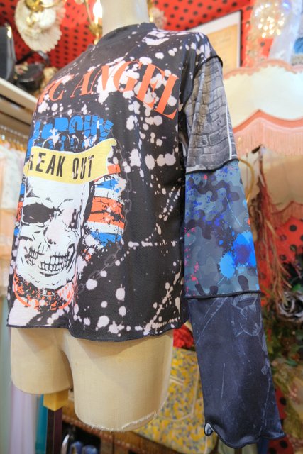 伸縮性のある異素材ドッキングデザインがユニークでインパクトたっぷりのヴィンテージリメイクカットソー ブラウスやタートル、シャツワンピースと合わせてもお洒落な個性派アイテム!