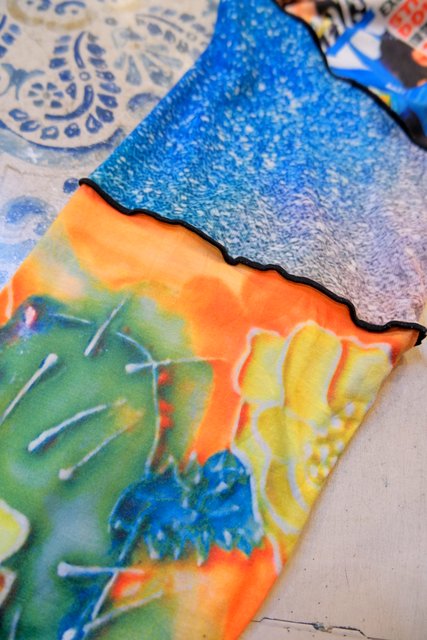 伸縮性のある異素材ドッキングデザインがユニークでインパクトたっぷりのヴィンテージリメイクカットソー ブラウスやタートル、シャツワンピースと合わせてもお洒落な個性派アイテム!