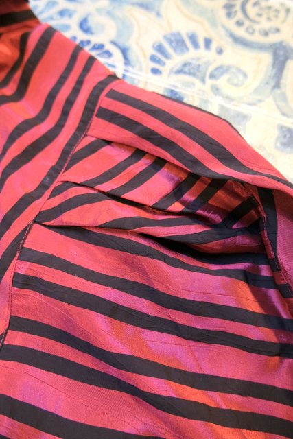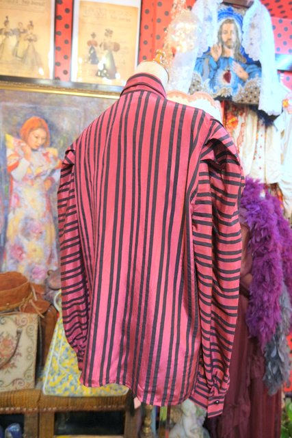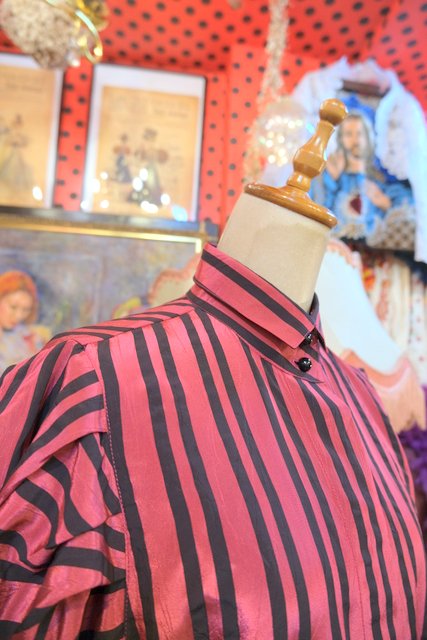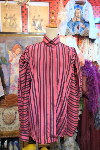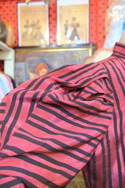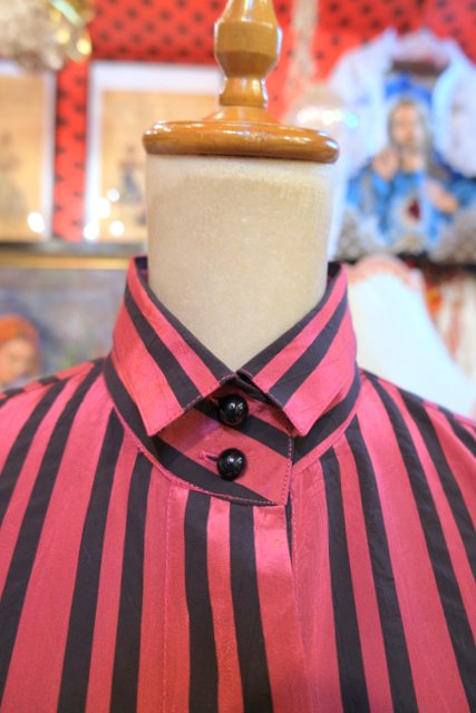 光沢感があるストライプにドゥエボットーニカラーやボリュームパフスリーブデザインがお洒落な1980年代頃のヨーロピアンヴィンテージブラウス