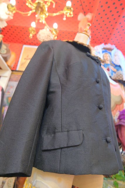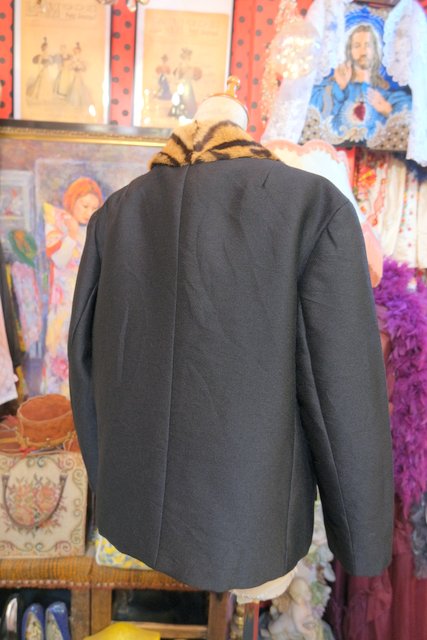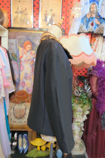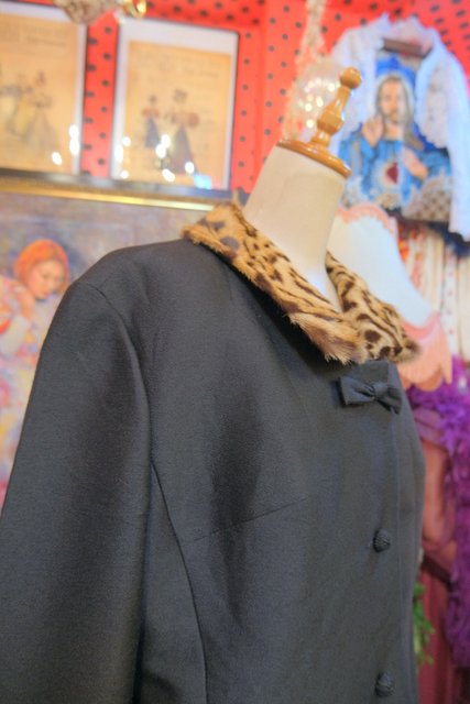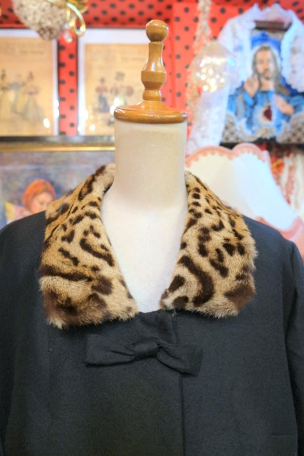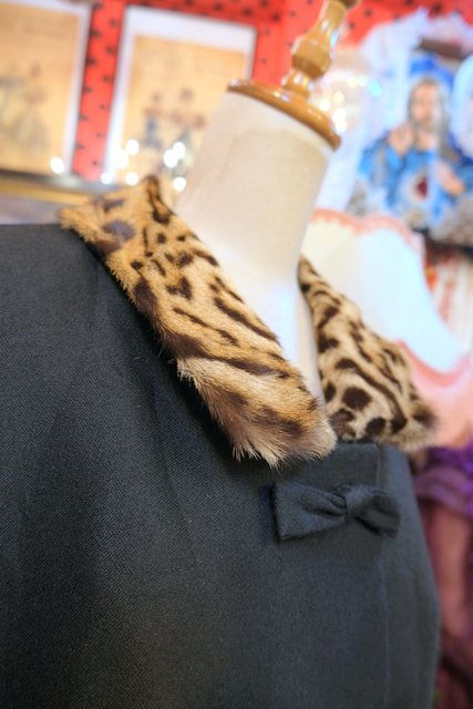 レオパード柄のミンクファー襟にリボンやレトロボタンがお洒落な1950年代頃のヨーロピアンアンティークジャケット
