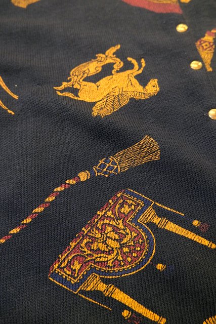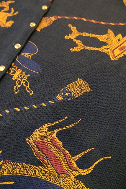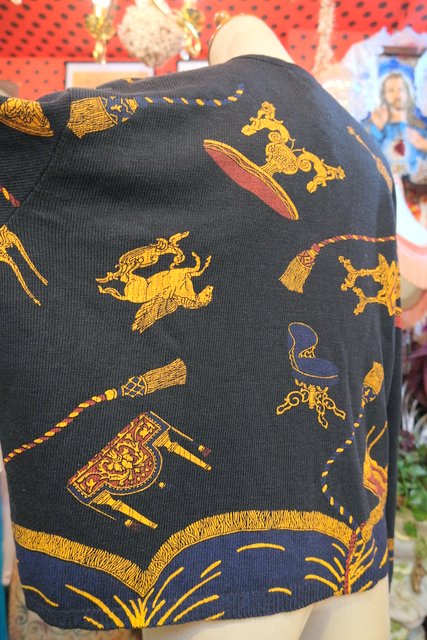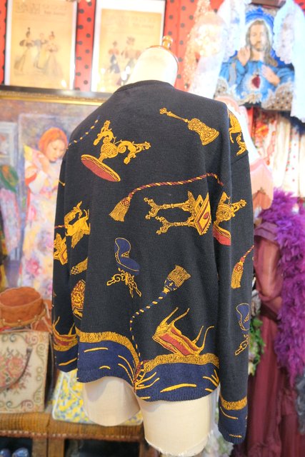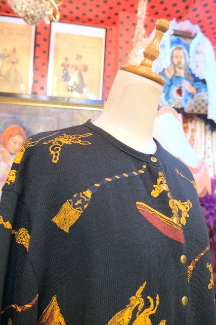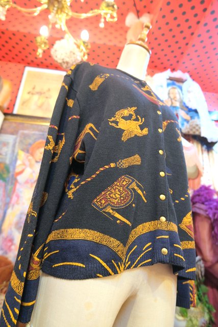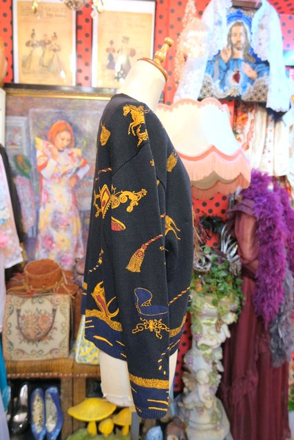 黒ベースにアンティーク家具&タッセルプリントや裾のネイビードレープカーテン柄が魅力的なフランス製レトロカーディガン ★SALE★