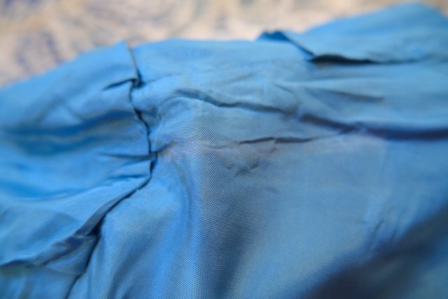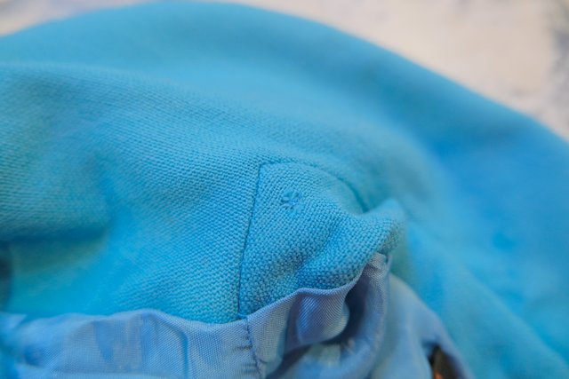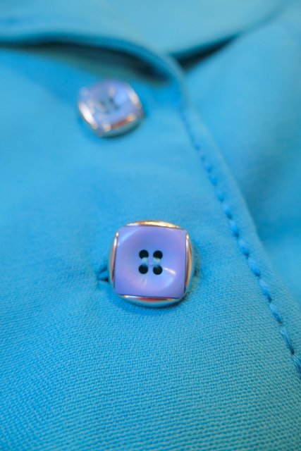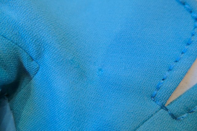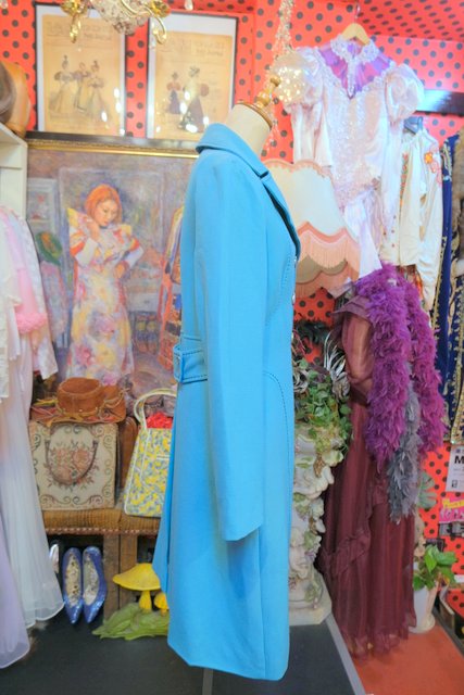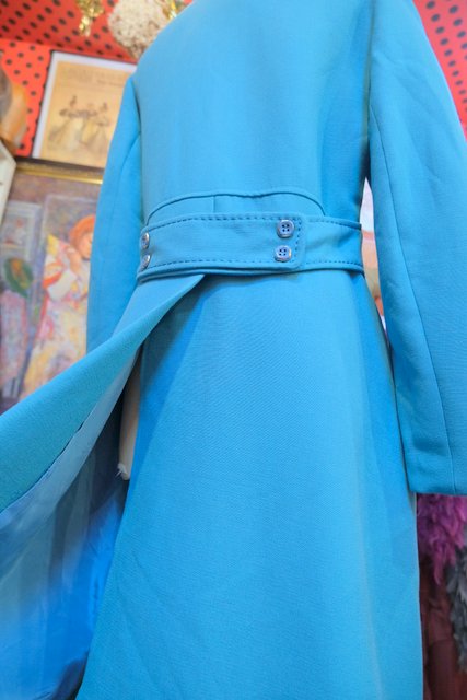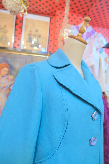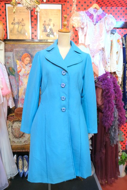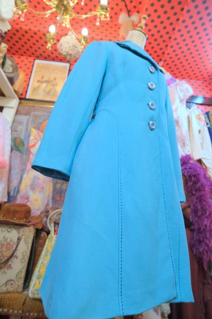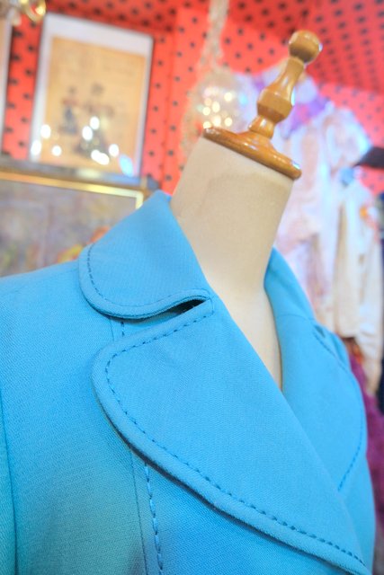 目を惹くポップな水色ベースに丸みのある襟や太いステッチ、レトロボタンが魅力的な1960~70年代頃のヨーロピアンヴィンテージコート