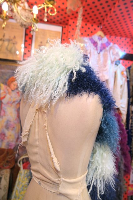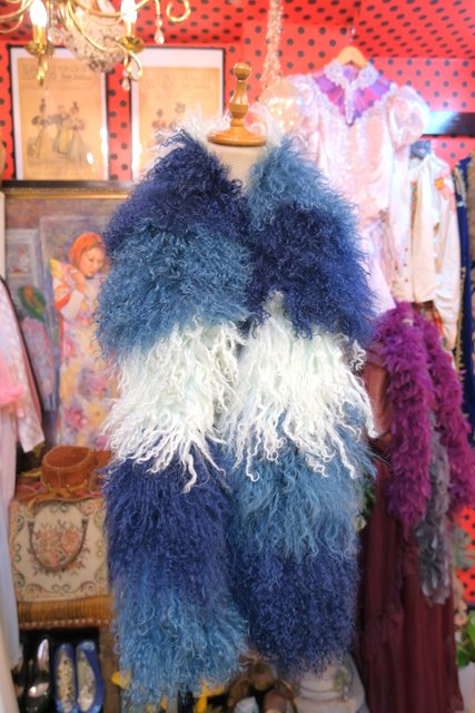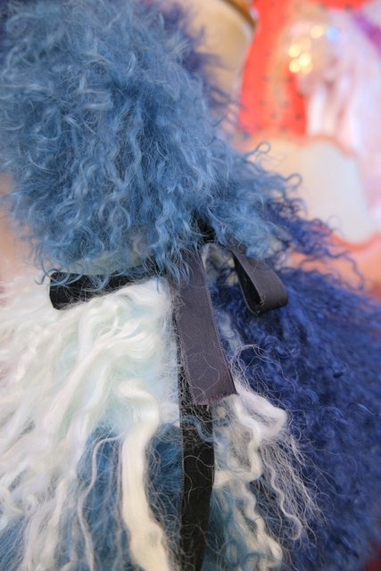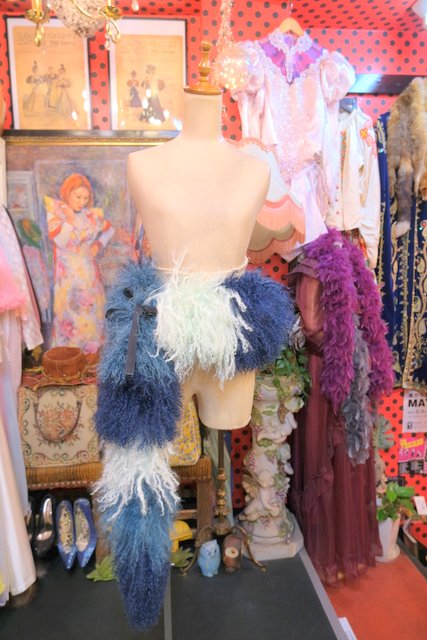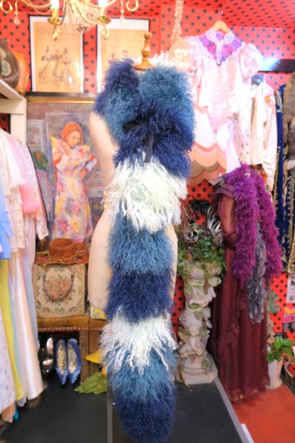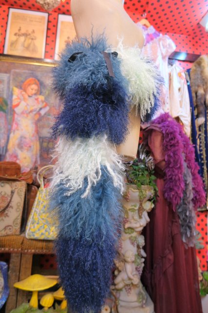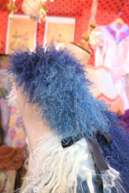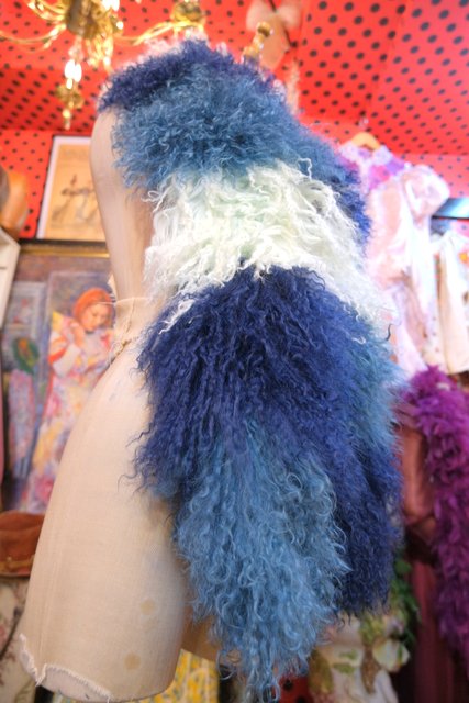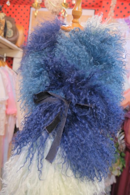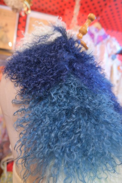 淡い水色~ネイビーのグラデーションカラーにボリューミーでくるくるカールした綿毛が可愛らしいイングランド製FLORENCE BRIDGEチベットラムファーマフラー ロング丈&片方に紐付きなので色々アレンジできるお洒落アイテム!