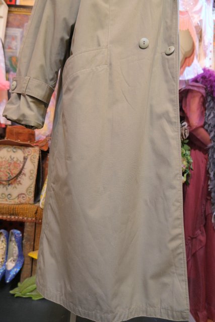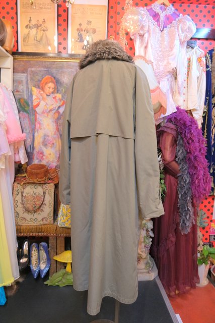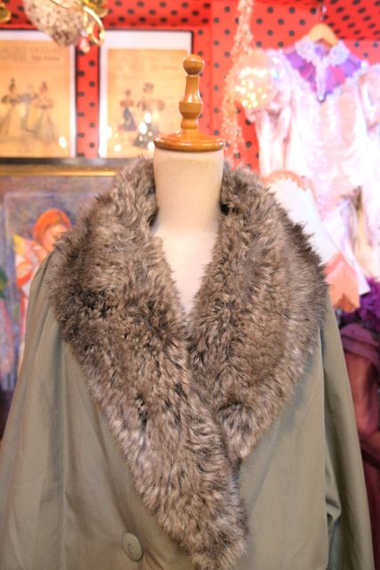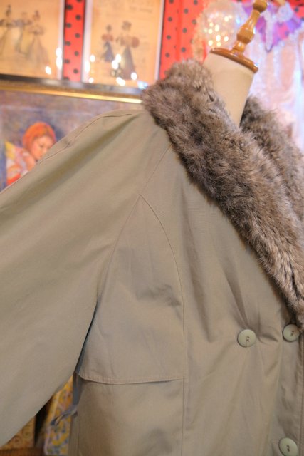 大人モードなカーキベースにボリューミーなフェイクファー襟や暖かいボア付きインナー、厚手のニットもすっきり着用できるラグランスリーブが魅力的な1980年代頃のフランス製ヴィンテージロングコート