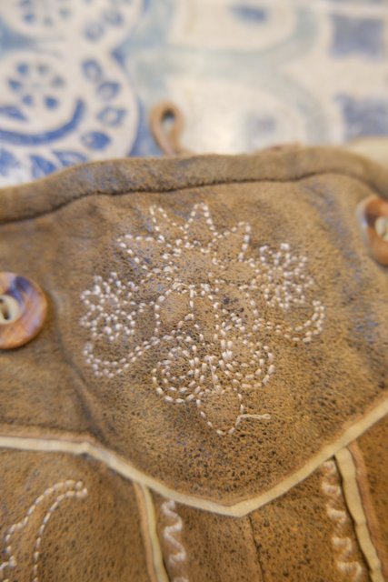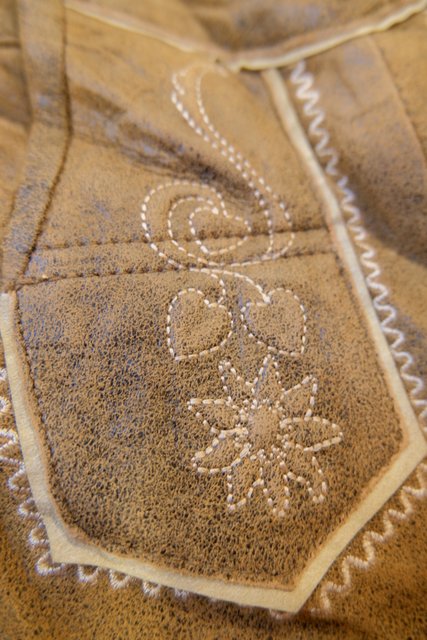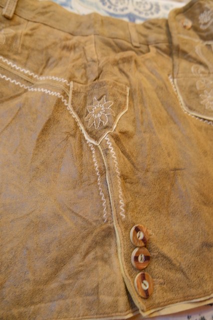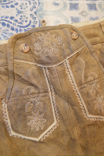 レーダーホーゼンのようなデザインにお花やハートの刺繍やステッチが可愛らしいヨーロピアンヴィンテージチロルレザースカート サスペンダーとあわせても可愛いアイテム!