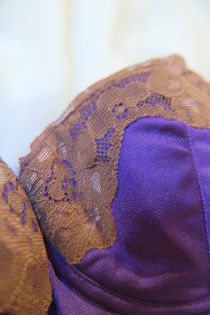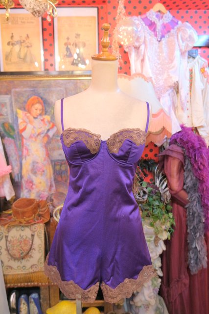 濃いパープルベースに茶系のレースデザインがクラシカルなヨーロピアンスリップボディブリファー 股下のボタンを外してアレンジしてもお洒落な個性派アイテム!