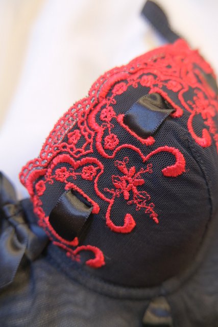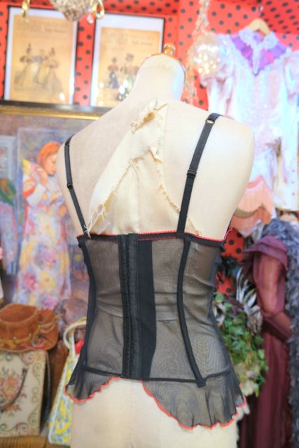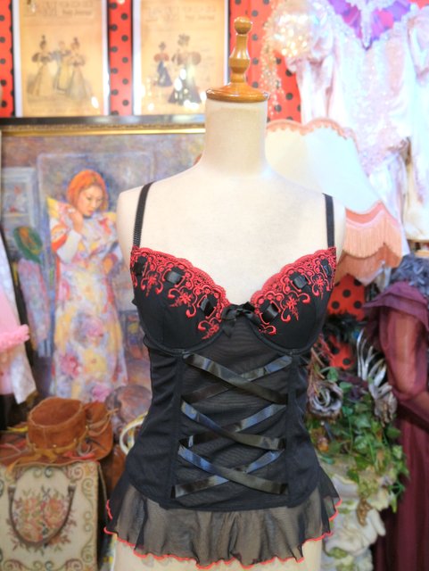 透け感がある黒シフォンに黒リボンや赤い刺繍が魅力的なヨーロピアンコルセット 大胆に肌見せスタイルやブラウスと合わせてもカッコ可愛いお洒落アイテム!