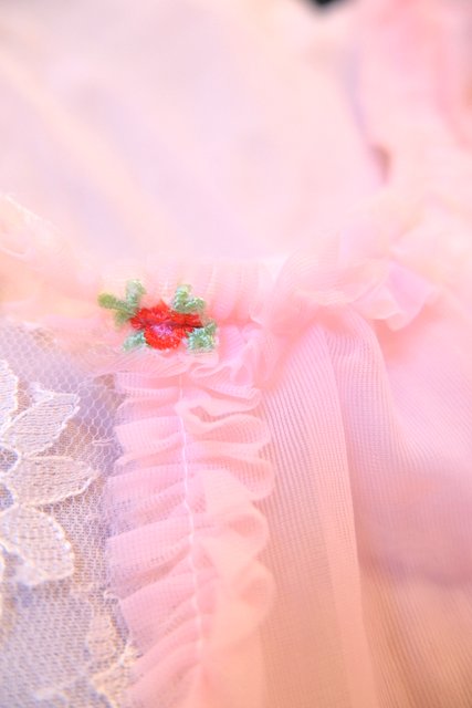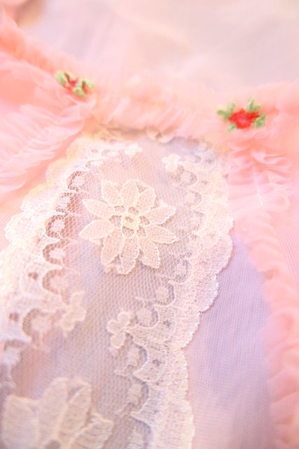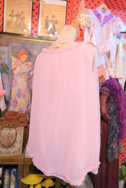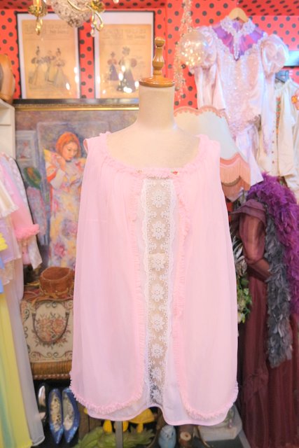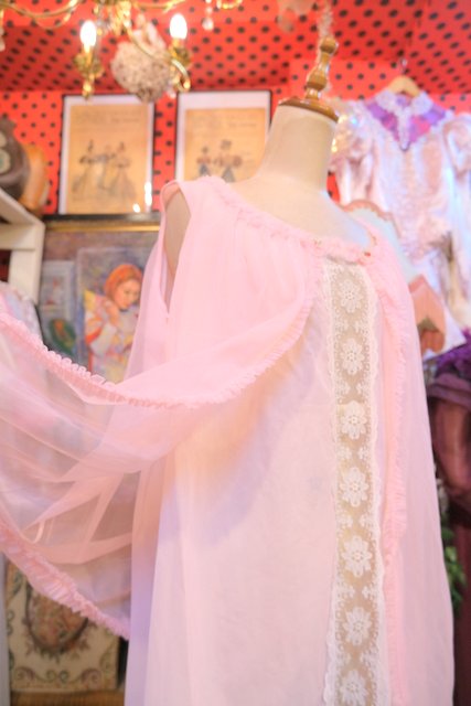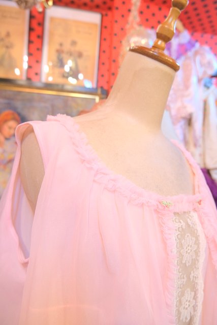 ロマンテックガーリーな透け感があるピンクシフォン×レース付きインナーのレイヤードデザインが可愛い1970年代頃のヨーロピアンヴィンテージネグリジェ