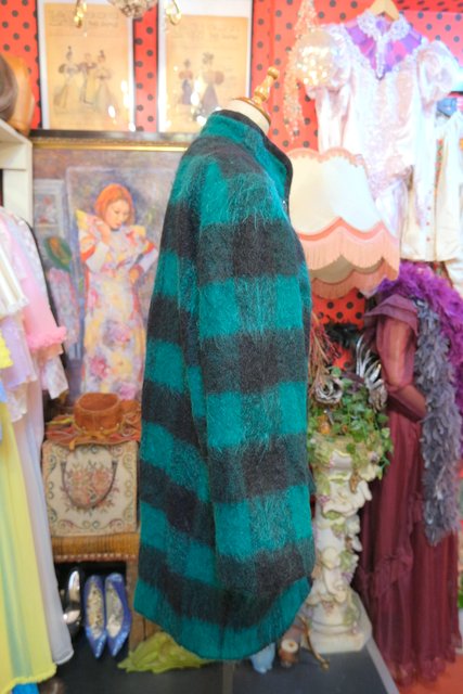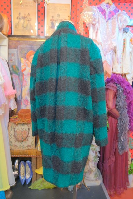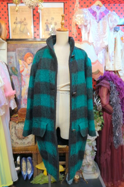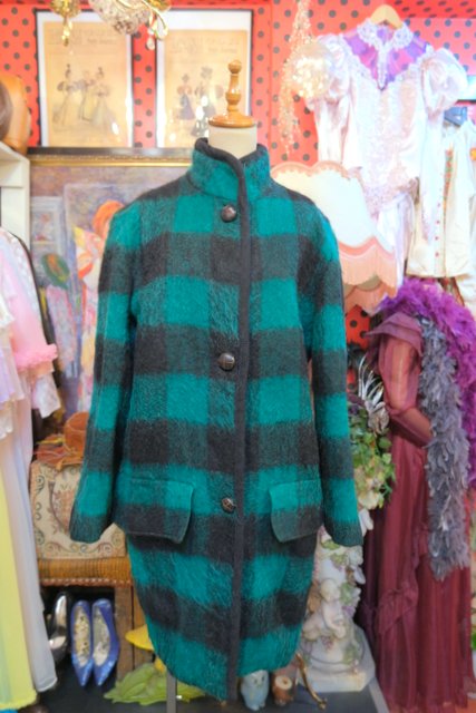 グリーン×黒の毛足が長いウールにスタンドカラーや裾にかけてタイトなシルエットがカッコいい1980年代頃のフランス製gerard pasquierヴィンテージチェックコート ★SALE★