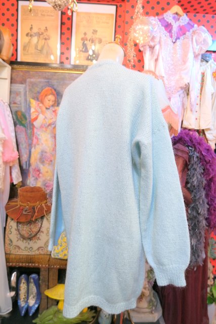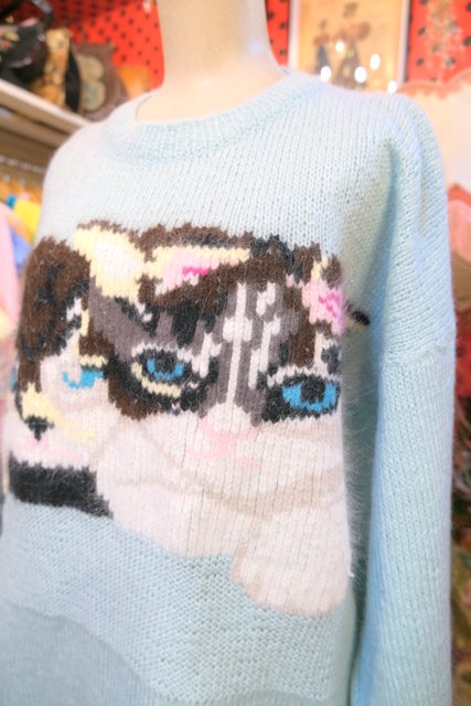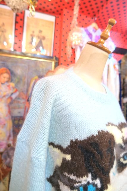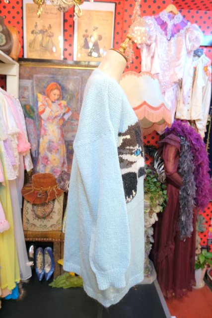 メルヘンな水色ベースに2匹の子猫デザインが可愛らしいヨーロピアンオーバーサイズニットワンピース