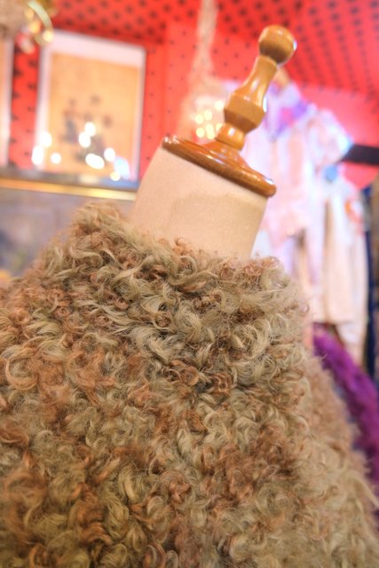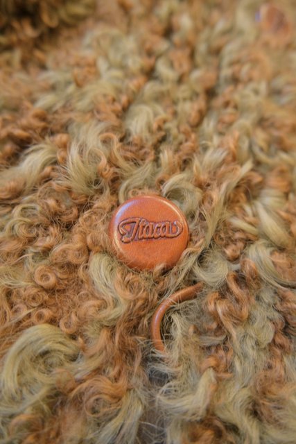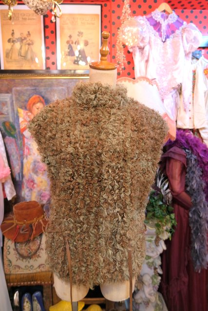 カーキ×茶色のカールした毛足が特徴のチベットラムファーに紐付きやボタンが可愛い1960~70年代頃のヨーロピアンヴィンテージファーベスト