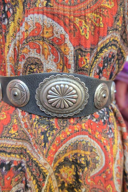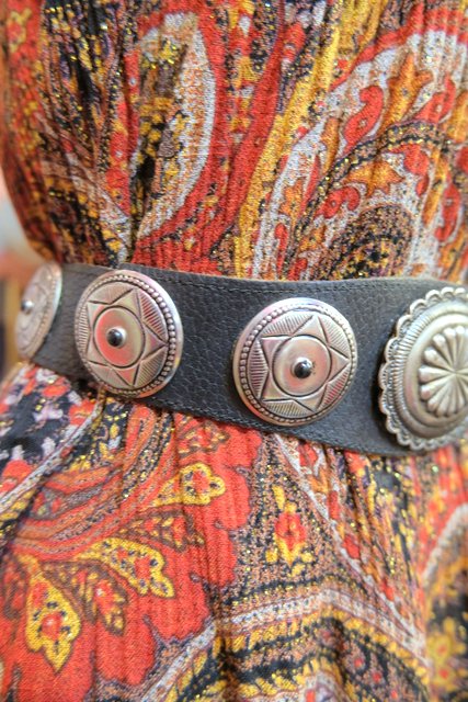 本革に付いた大きめのコンチョがBOHOスタイルにぴったりなコーデのポイントになるヨーロピアンレザーベルト