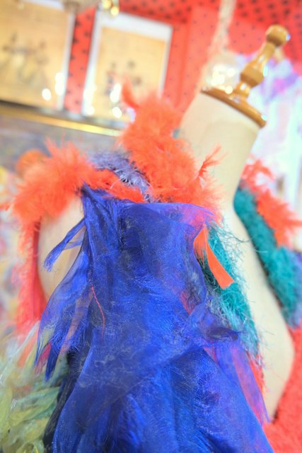 モジャモジャしたシャギーベストに透け感があるネイビーチュール×カラフルで大きなフェザーのボリュームデザインが遊び心たっぷりのヨーロピアンハンドメイドパーティーベスト