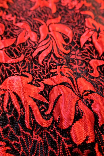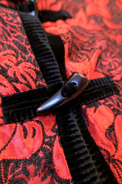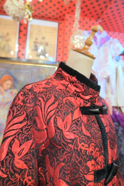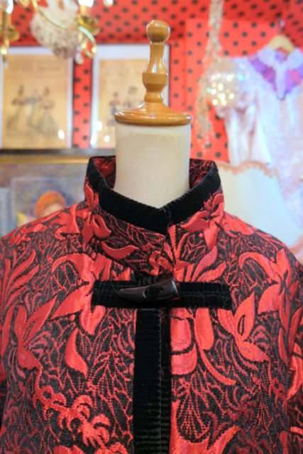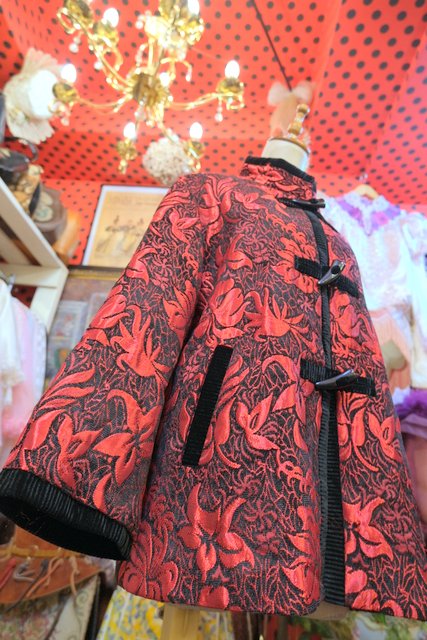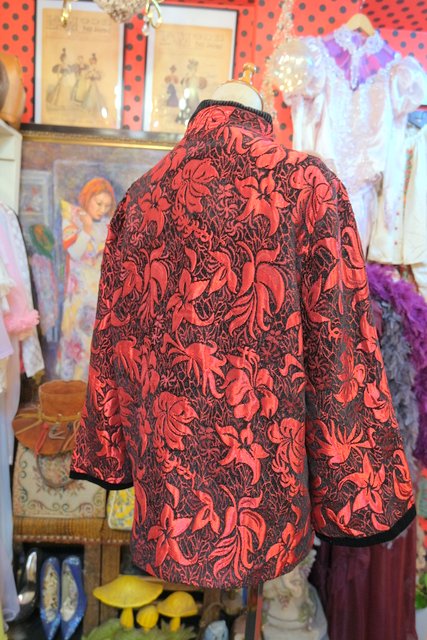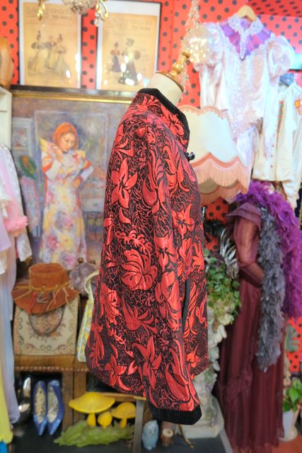 光沢があるボタニカル柄に黒ベロアパイピングやトグルボタンが素敵なヨーロピアンファンキージャケット