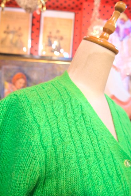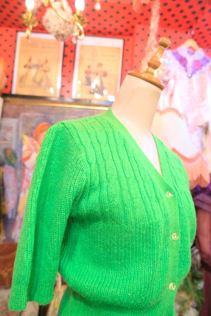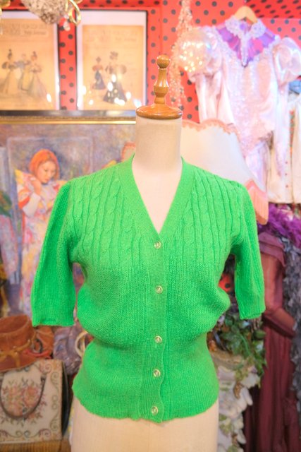 色鮮やかな黄緑色にケーブル編み×リブの切り替えデザインが可愛い1960~70年代頃のヨーロピアン半袖ニットカーディガン