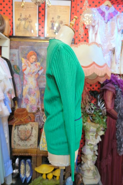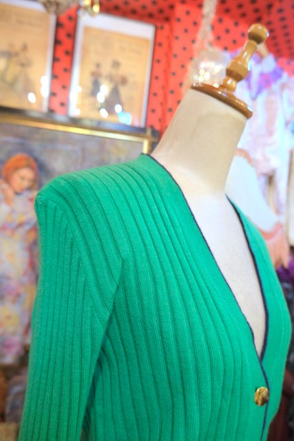 ストライプのような凹凸があるリブニットに濃紺パイピングやポケットがレトロ感たっぷりの1970~80年代ヨーロピアンニットカーディガン