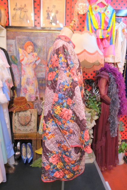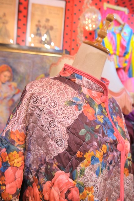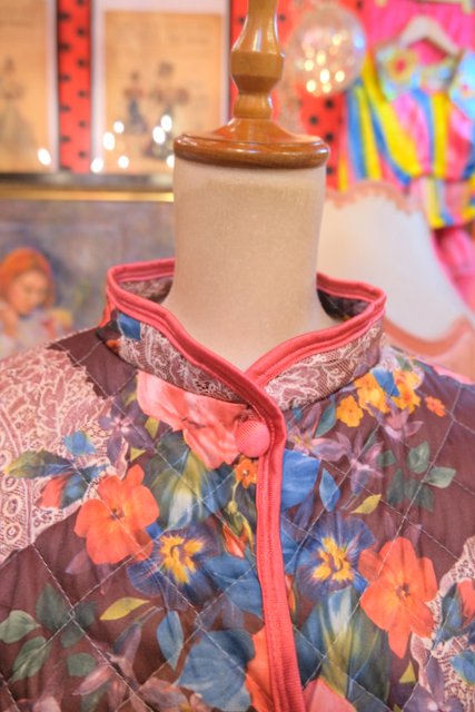 エレガントな花柄プリントに光沢があるポピーレッド色のパイピングやボタンが可愛らしいフランス製キルティングガウン
