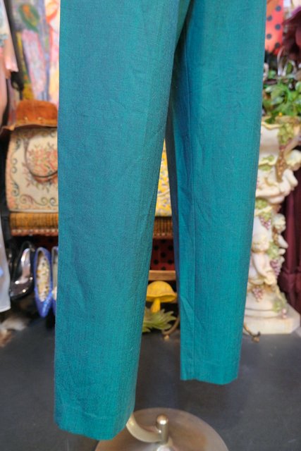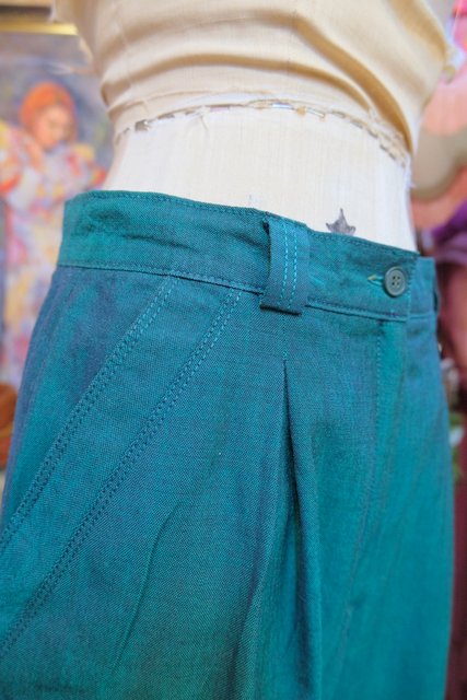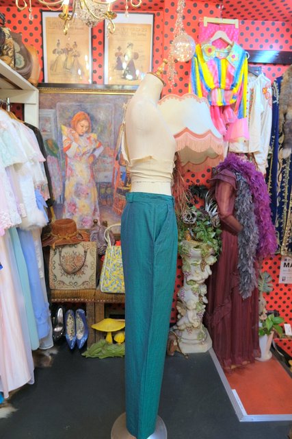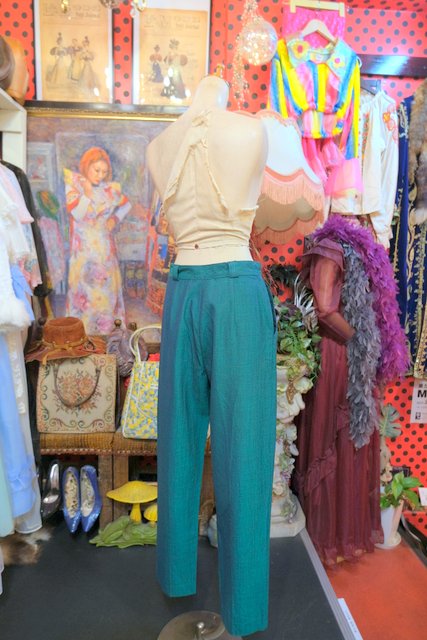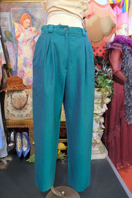 レトロなグリーンベースに腰周りがゆったりとしたタックデザインがお洒落な1970年代頃のヨーロピアンヴィンテージパンツ
