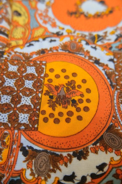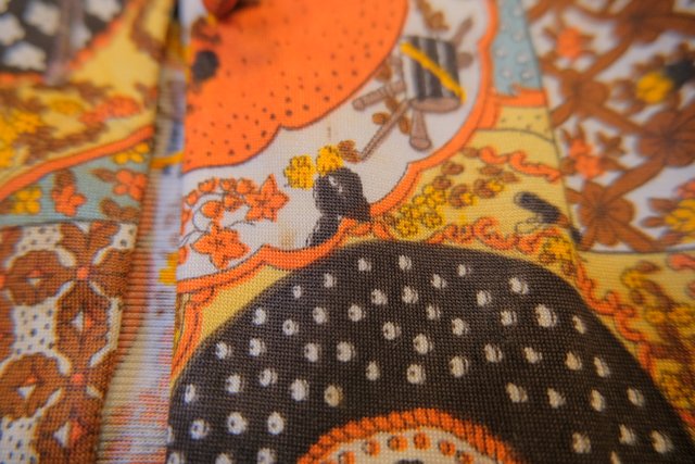 鳥や天使、ペイズリー、花柄などのレトロヒッピーな総柄が魅力的な1970年代頃のフランス製ヴィンテージブラウス