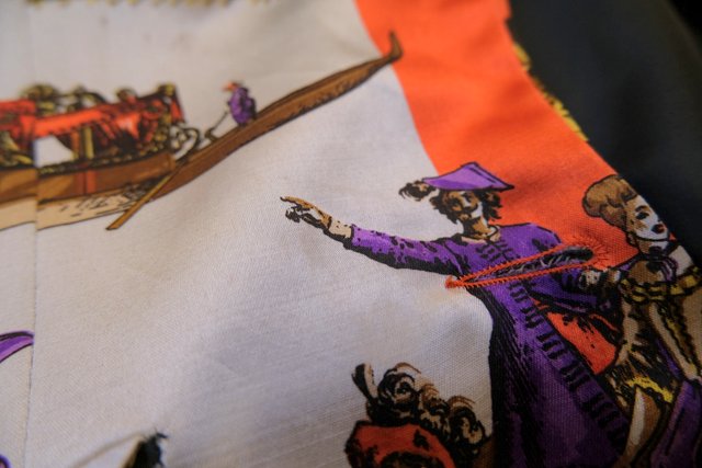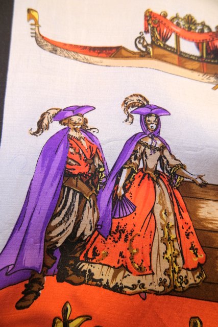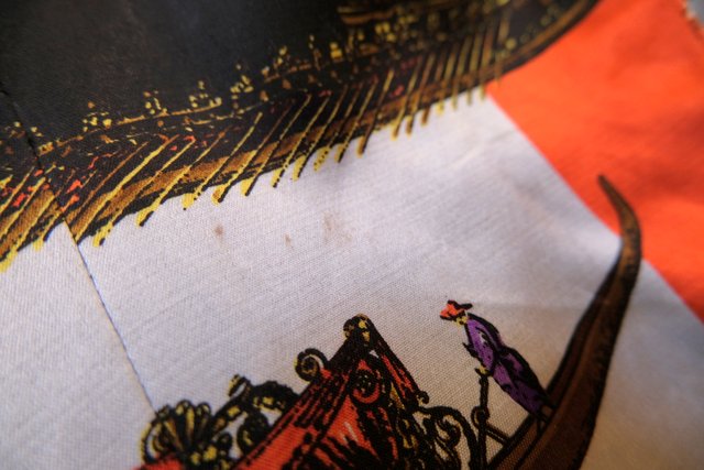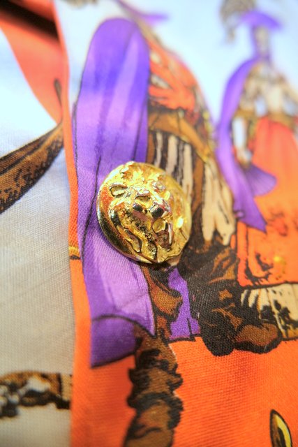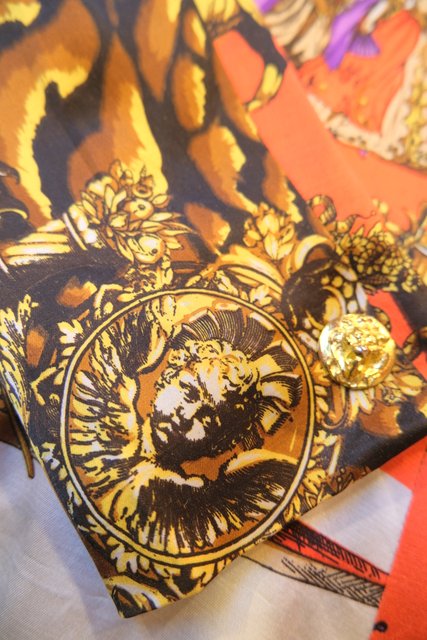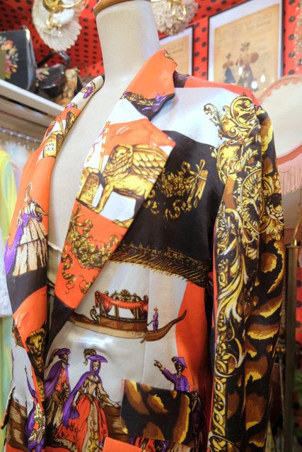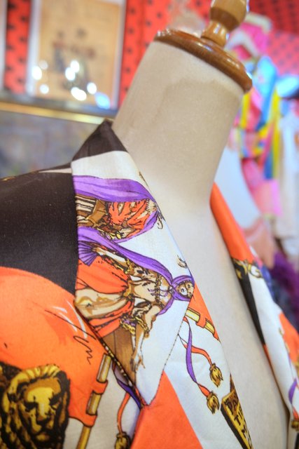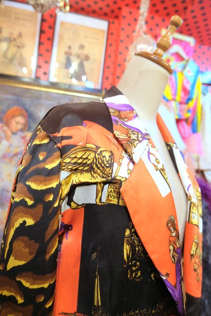 ヴェネツィアの旗などに描かれるライオンや舞踏会、天使、立体感のあるライオンボタンなど目を惹く総柄プリントが素敵な1970年代頃のフランス製ヴィンテージジャケット