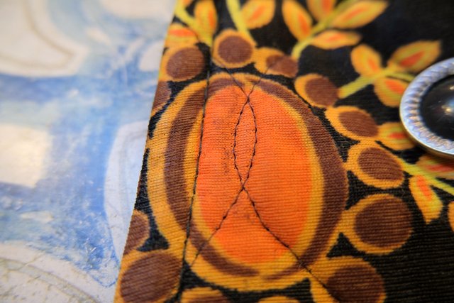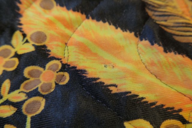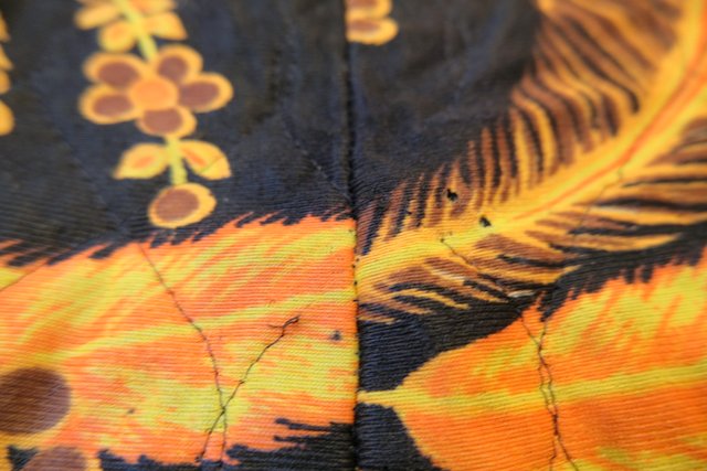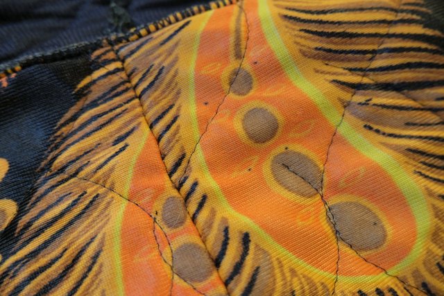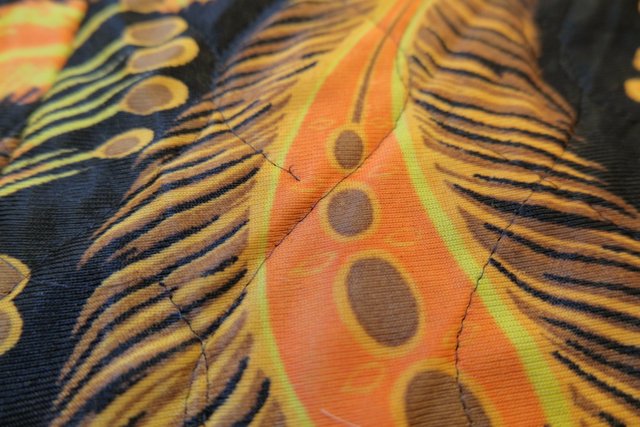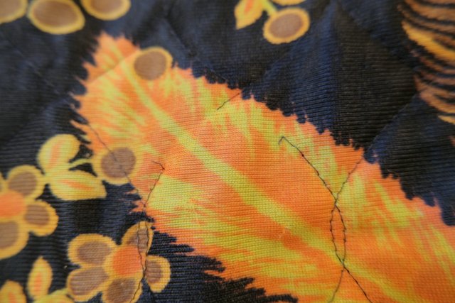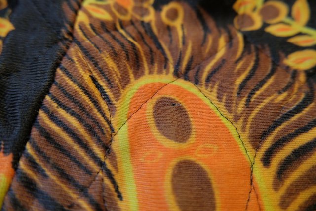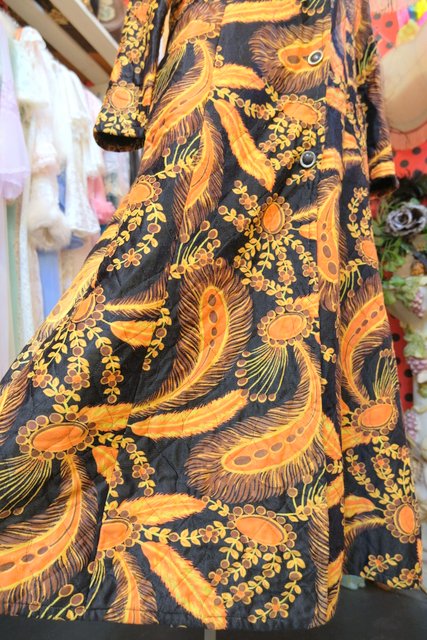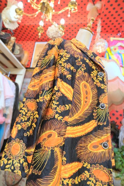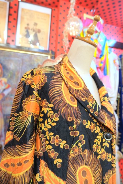 レトロ感たっぷりの孔雀の羽プリントが目を惹く1970年代頃のヨーロピアンヴィンテージキルティングコート