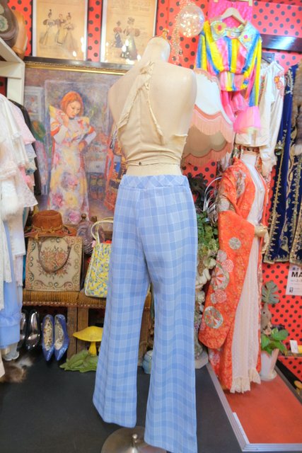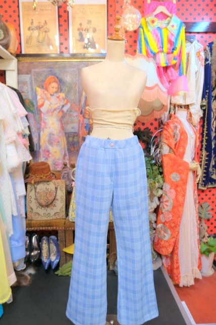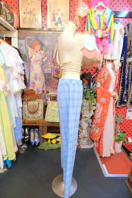 北欧風な淡いブルーグレイ×白のチェックデザインが魅力的な1970年代頃のヨーロピアンヴィンテージレトロパンツ
