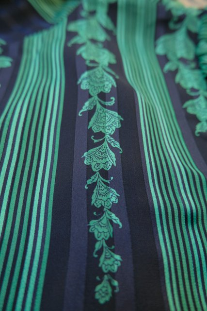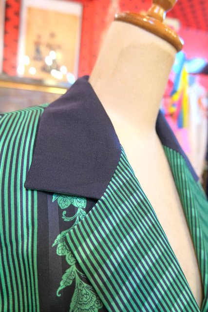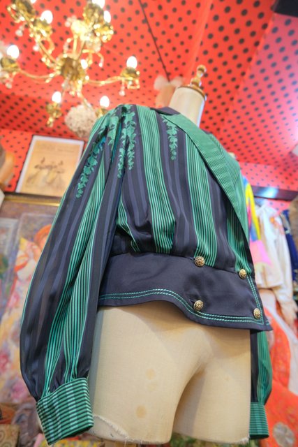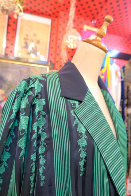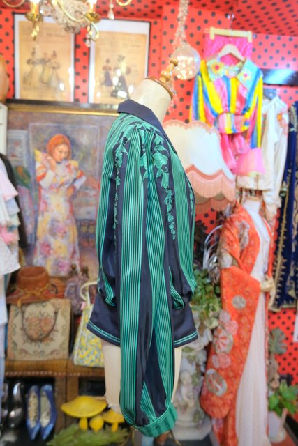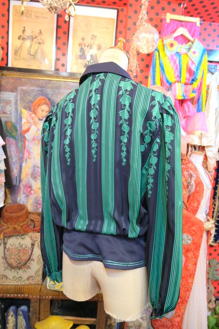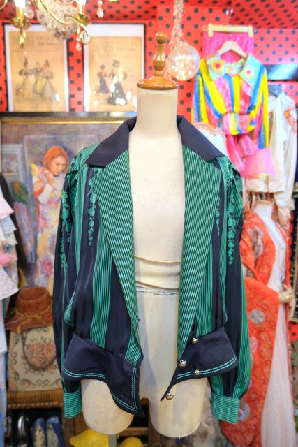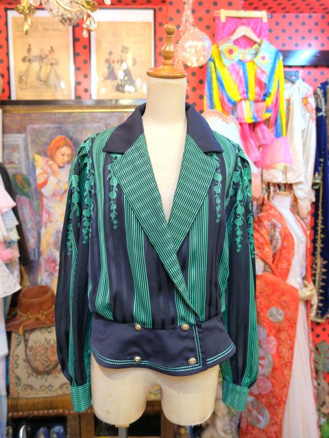 黒×グリーンのストライプにレトロな花柄や袖の透け感がお洒落な1980年代頃のヨーロピアンヴィンテージシャツジャケット