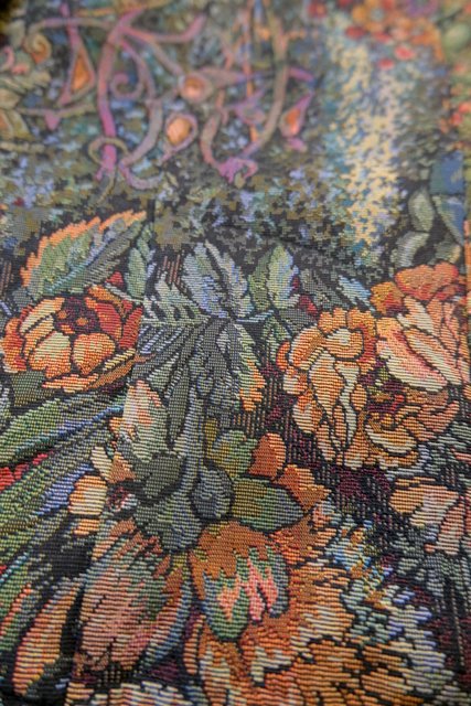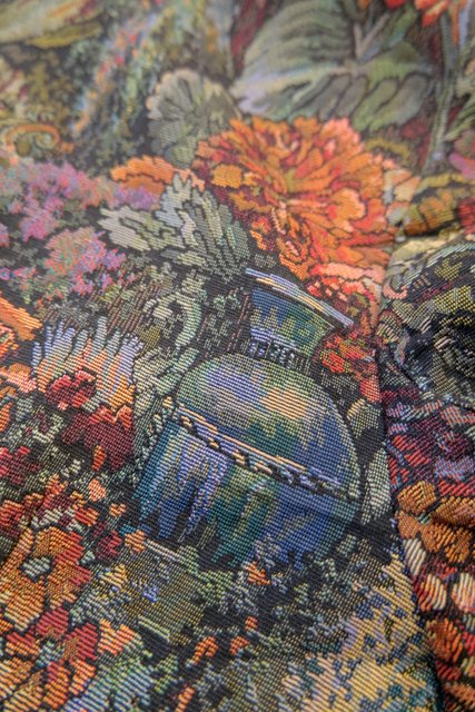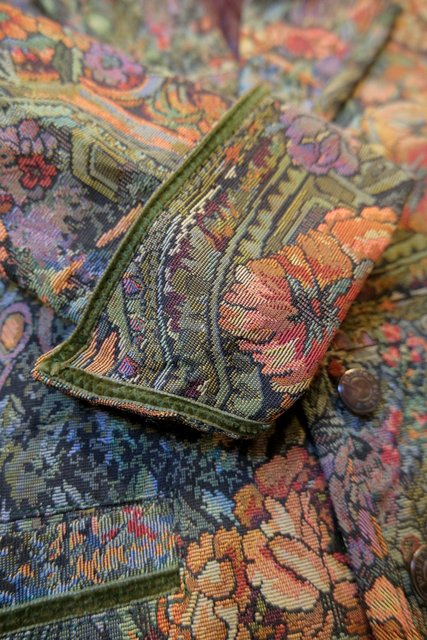 落ち着いた色合いの草木やお花の庭園ゴブラン織りにスタイリッシュなスタンドアウトカラーやウィングドカフスが素敵な1980年代頃のスペイン製ヴィンテージジャケット